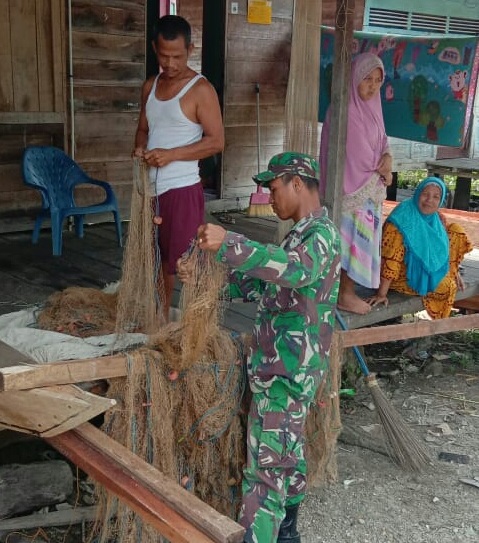Aceh Singkil – Babinsa Koramil 02/Singkil Kodim 0109/Singkil, Kopda Suparlan membantu memperbaiki jaring milik nelayan yakni pak Iwan warga Desa Rantau gedang Kecamatan Singkil, Aceh Singkil, Rabu (03/04/2019).