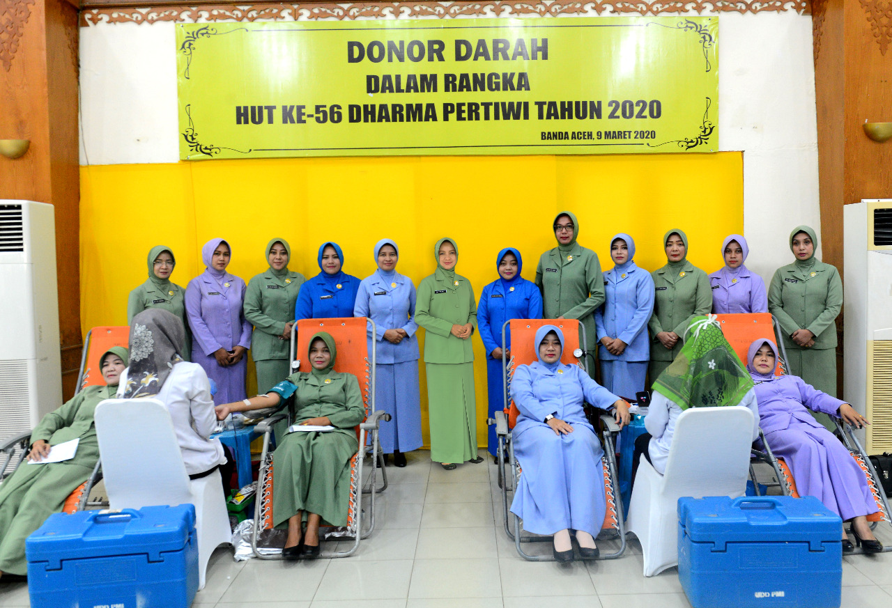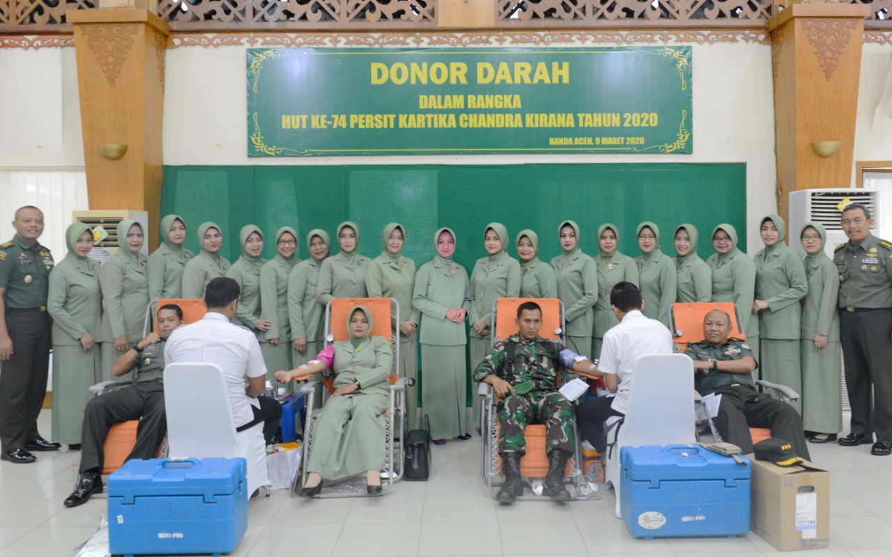 Kegiatan donor darah yang diikuti puluhan Prajurit TNI dan Persit Kodam Iskandar Muda serta perwakilan Jala Senastri dan Pia Ardhya Garini ini, dalam rangka HUT ke – 74 Persit Kartika Chandra Kirana dan HUT ke – 56 Dharma Pertiwi tahun 2020.
