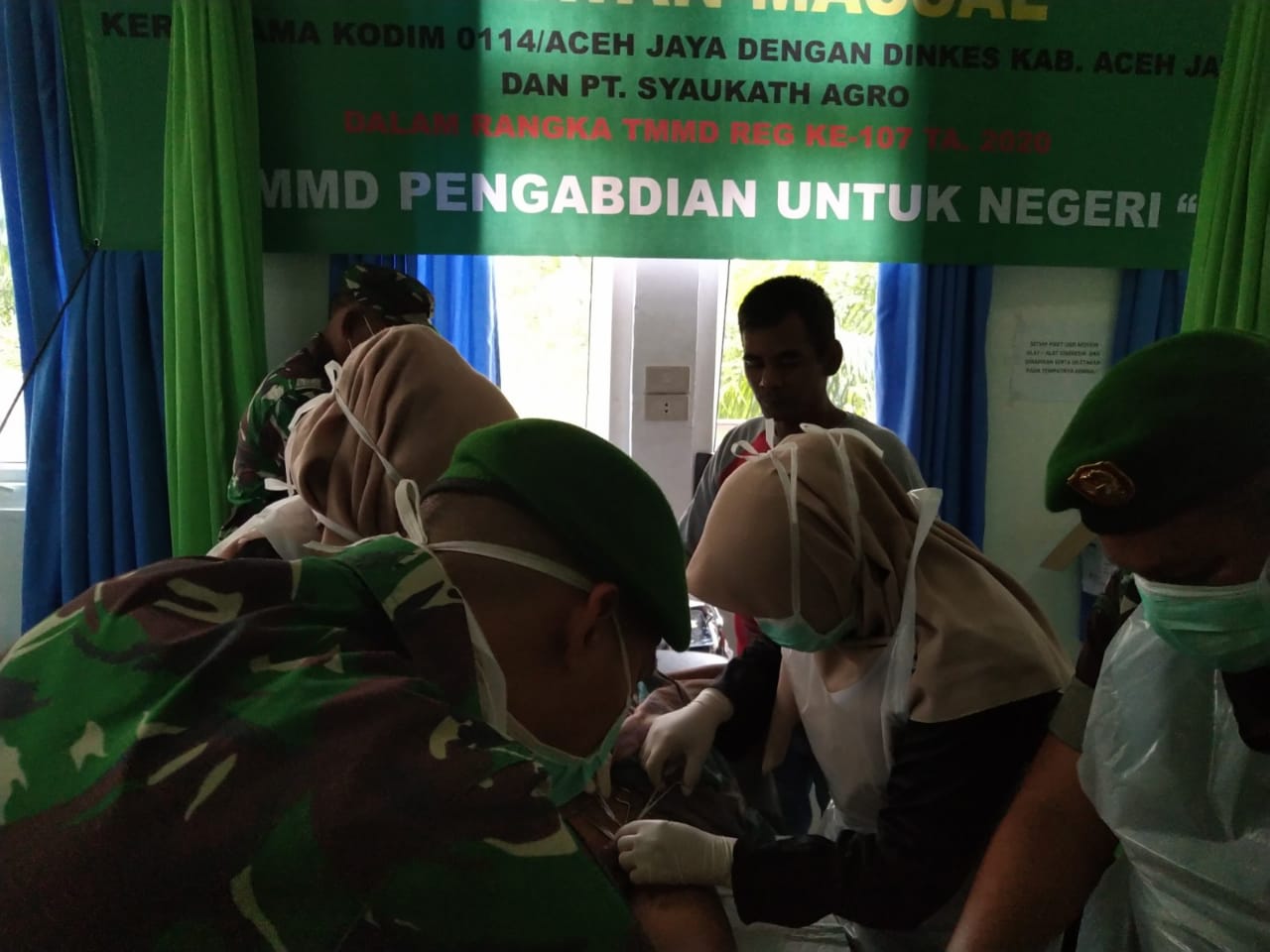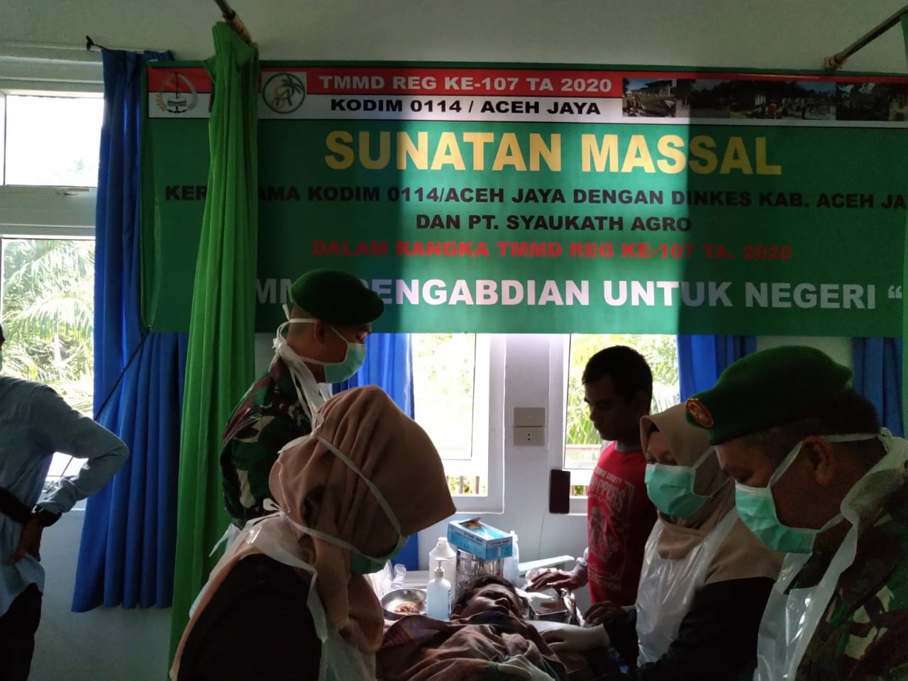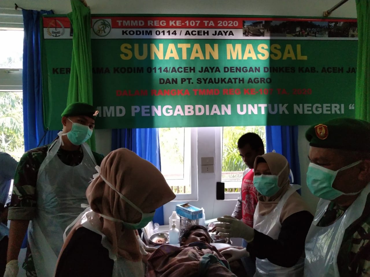 Aceh Jaya – Kodim 0114/Aceh Jaya bekerja sama dengan Dinas Kesehatan Kabupaten Aceh Jaya, Rumah Sakit TK IV Iskandar Muda 07.02 Meulaboh menggelar kegiatan sunat massal/khitan bagi puluhan anak yang berasal dari keluarga kurang mampu, Sabtu (11/4/2020).