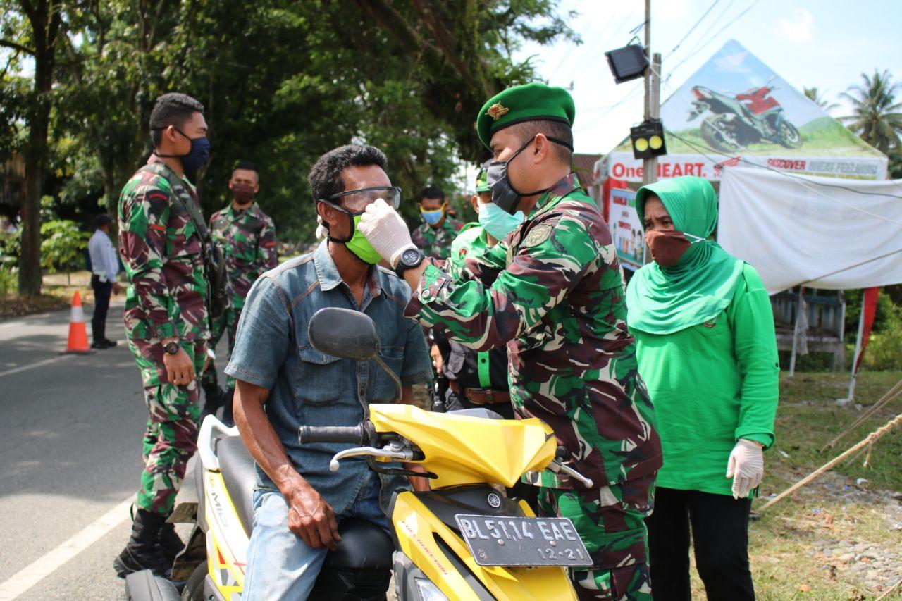 Posko Penanganan Covid – 19 di Desa Peunaga Cut, Kec. Meureubo, Kab. Aceh Barat yang berbatasan dengan Kab. Nagan Raya untuk membagikan 150 buah masker kepada masyarakat pengendara kendaraan lalu lintas.