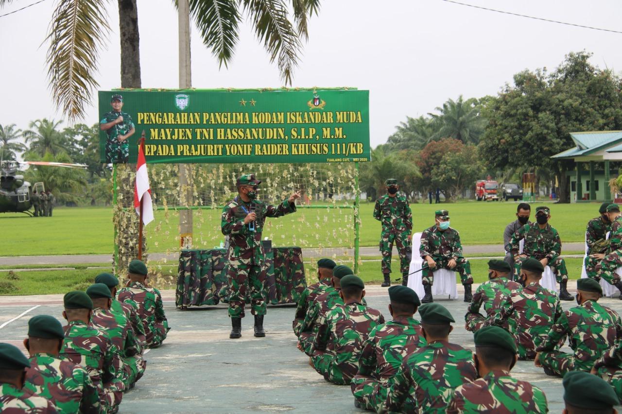 ACEH TAMIANG – Panglima Komando Daerah Militer Iskandar Muda  (Pangdam IM) Mayjen TNI Hassanudin,S.I.P, M.M. melaksanakan kunjungan kerja (kunker) ke Mayonif Raider Khusus 111/KB setiba nya Pangdam IM di kesatrian di sambut langsung oleh Danyonif Raider Khusus 111/KB Mayor Inf Galih Candra Buana,S.I.P. Kamis (14/5/2020)