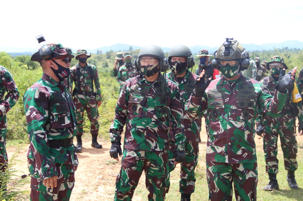 Aceh Besar – Panglima Kodam Iskandar Muda, Mayjen TNI Hassanudin, S.I.P, M.M, meninjau pelaksanaan latihan menembak Senjata Berat Kendaraan Tempur Batalyon Kavaleri 11/MSC di Desa Cucum, Jantho, Aceh Besar, Kamis (06/08/20).