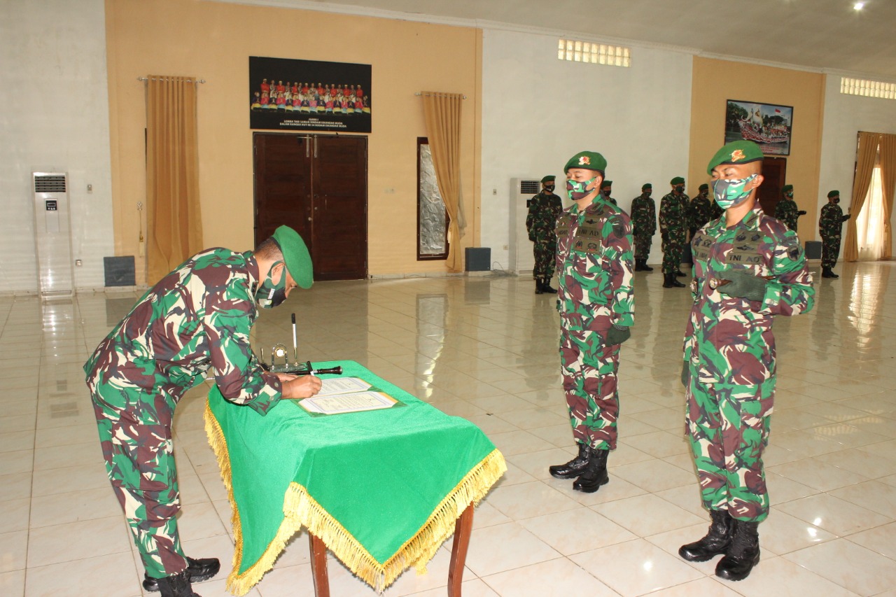Aceh Besar, Danrindam IM Kolonel Inf Marzuki memimpin acara tradisi satuan dan serah terima jabatan pejabat Rindam IM bertempat di Aula Bhakti Utama Rindam IM, Mata ie, Aceh Besar, Jum’at (07/08/20).