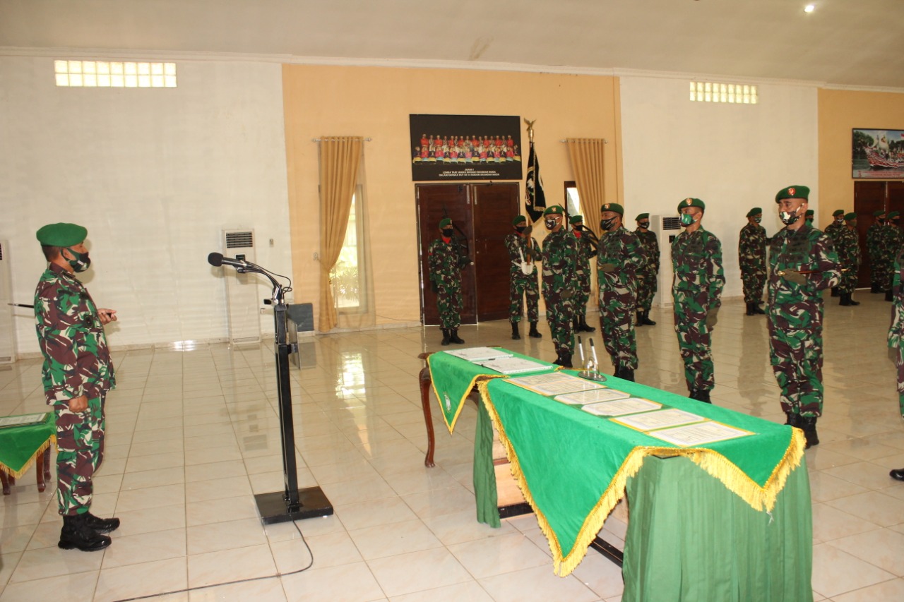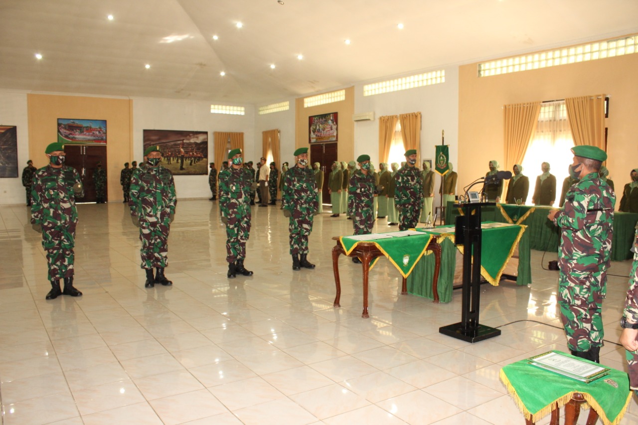 Aceh Besar, Danrindam IM Kolonel Inf Marzuki memimpin acara tradisi satuan dan serah terima jabatan pejabat Rindam IM bertempat di Aula Bhakti Utama Rindam IM, Mata ie, Aceh Besar, Jum’at (07/08/20).