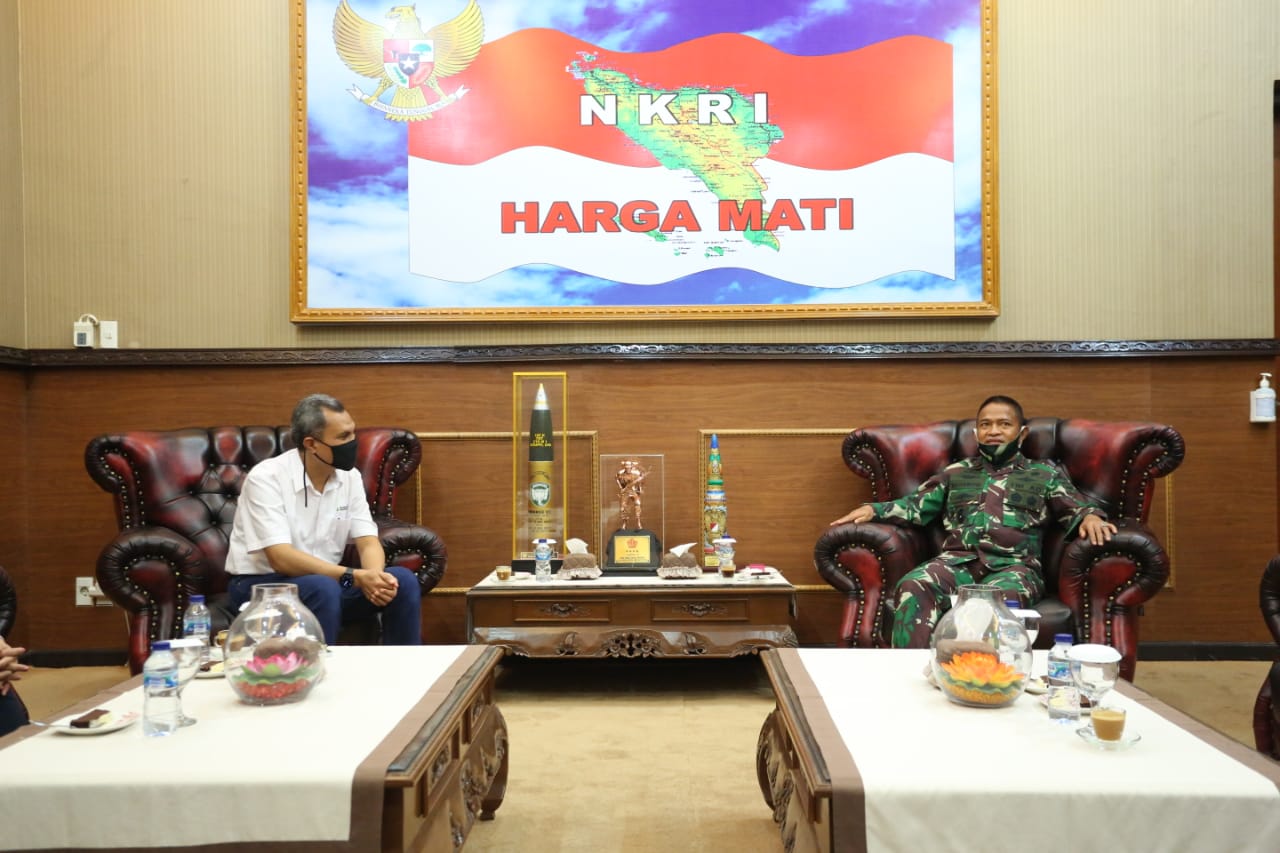 Banda Aceh – Panglima Kodam Iskandar Muda, Mayjen TNI Hassanudin S.I.P., M.M., menerima kunjungan dari General Manager PT. Solusi Bangun Andalas (SBA) Provinsi Aceh, Durain Parmanoan Siregar beserta staf di ruang tamu Pangdam IM, Makodam IM, Kamis (13/08/20).