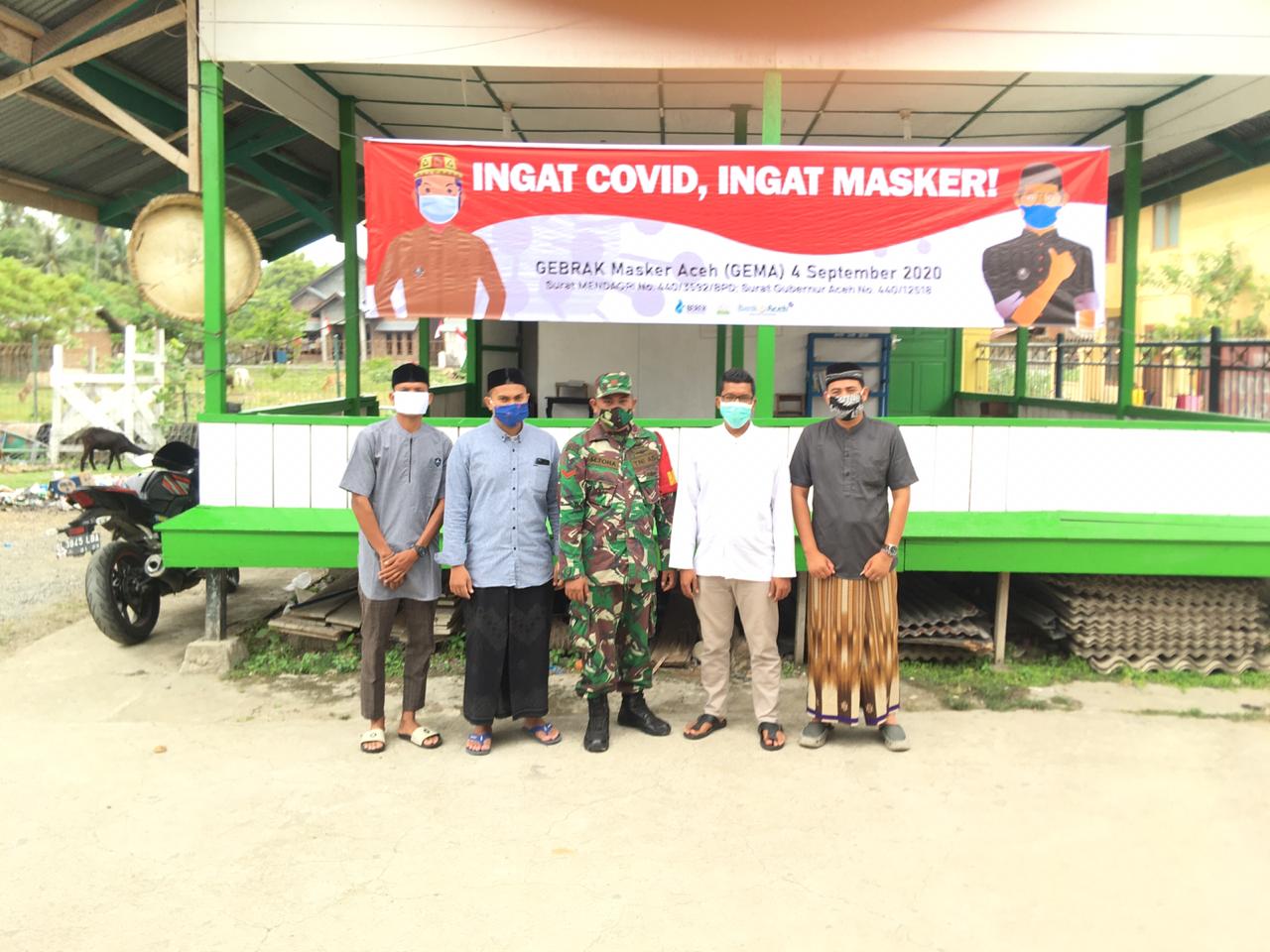 Aceh Besar – Guna terus menumbuhkan kesadaran masyarakat dalam bergotong royong mencegah serta memutuskan mata rantai penyebaran Covid-19, Babinsa 05/Mesjid Raya bersama remaja masjid Gampong Lamreh dan petugas Pemerintahan Kabupaten Aceh Besar (Pemkab Abes) melancarkan aksi Gebrak Masker (GEMA), Jumat (4/9/2020).