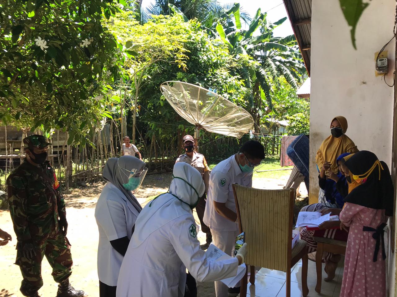 Aceh Besar,-Babinsa Koramil 04/Lhoong Kodim 0101/BS Serka Zulkifli dan Serda Hasnawi dampingi petugas Kesehatan dari Dinkes Puskesmas Lhoong untuk melakukan pemeriksaan serta rapid test terhadap Warga Desa Umong Seuribe kecamatan Lhoong kabupaten Aceh Besar, pada Rabu (09/09/20).