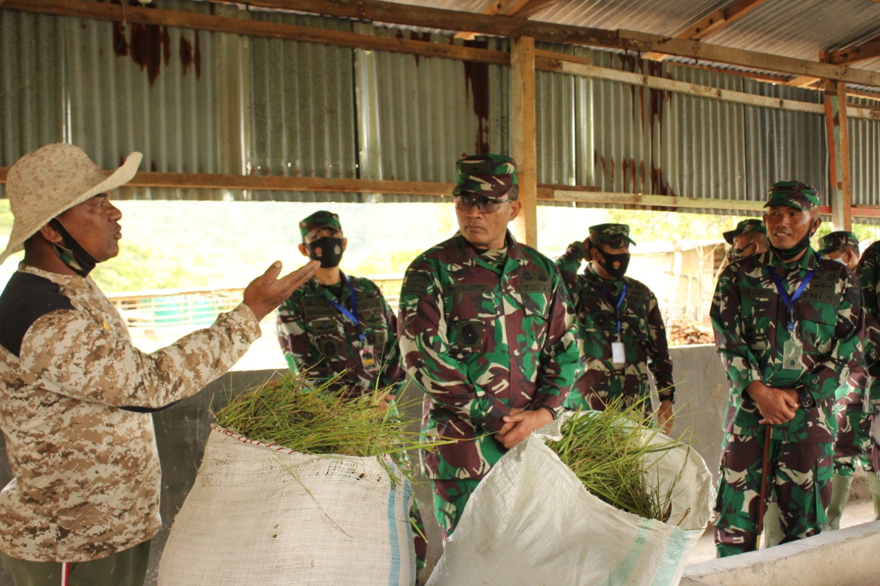 Setelah dari lokasi pengembangbiakan udang lobster air tawar, Kasdam beserta rombongan bergerak menuju sektor peternakan sambil melihat perkebunan tanaman pisang dan singgah di kolam budidaya ikan patin dan gurame untuk menabur bibit ikan.