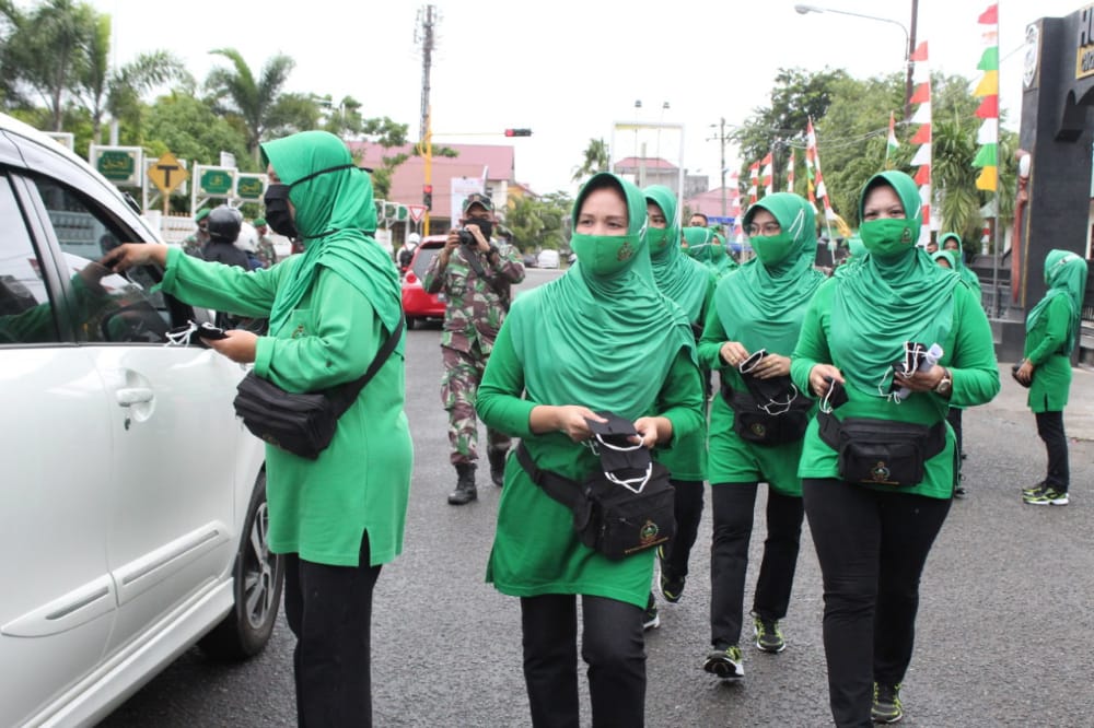 Banda Aceh – Peduli terhadap dampak wabah virus Corona, Satuan Hubdam IM beserta Persit Ranting 3 Hub  turut melakukan pencegahan penyebaran Covid-19 dengan membagikan masker kerjasama dengan rekan seprofesi PT Batik Danliris kepada masyarakat di sejumlah lokasi di Kota Banda Aceh. (11/9/20).