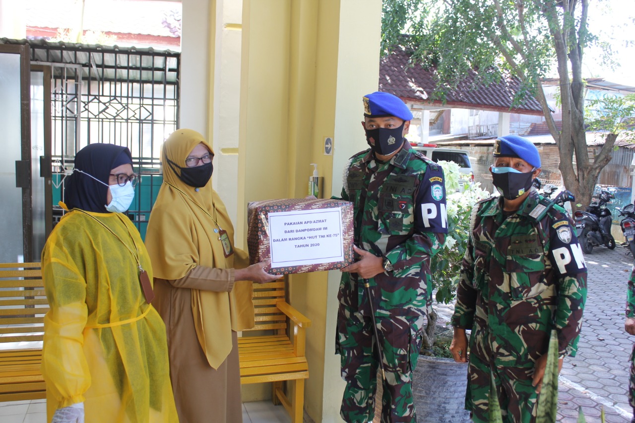 Dalam Rangka HUT TNI Ke 75 Pomdam IM Membagikan APD Ke Puskesmas Baiturrahman Dan Puskesmas Meuraxa