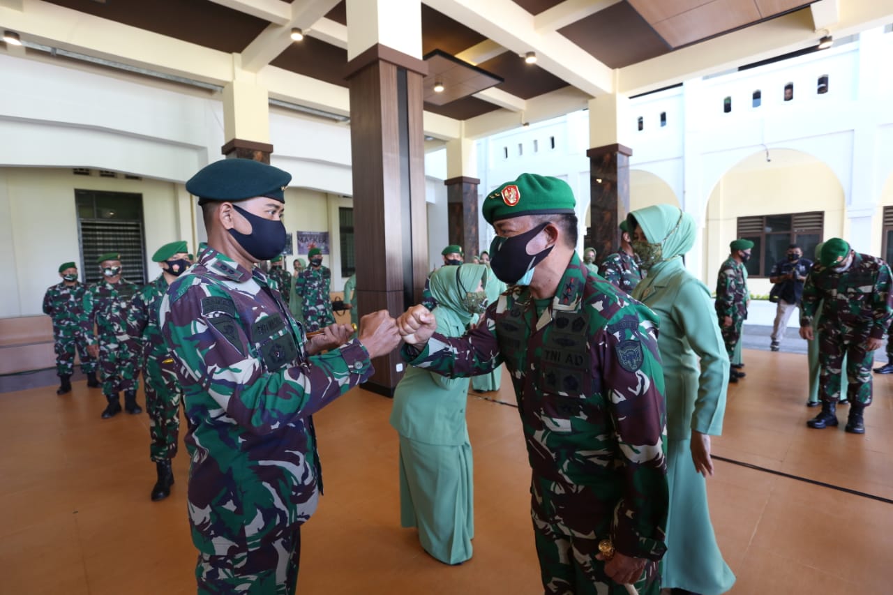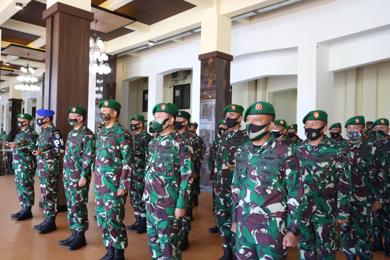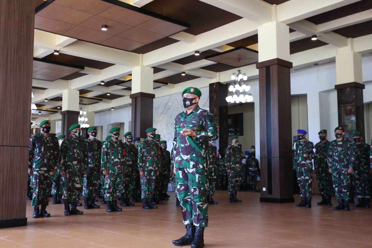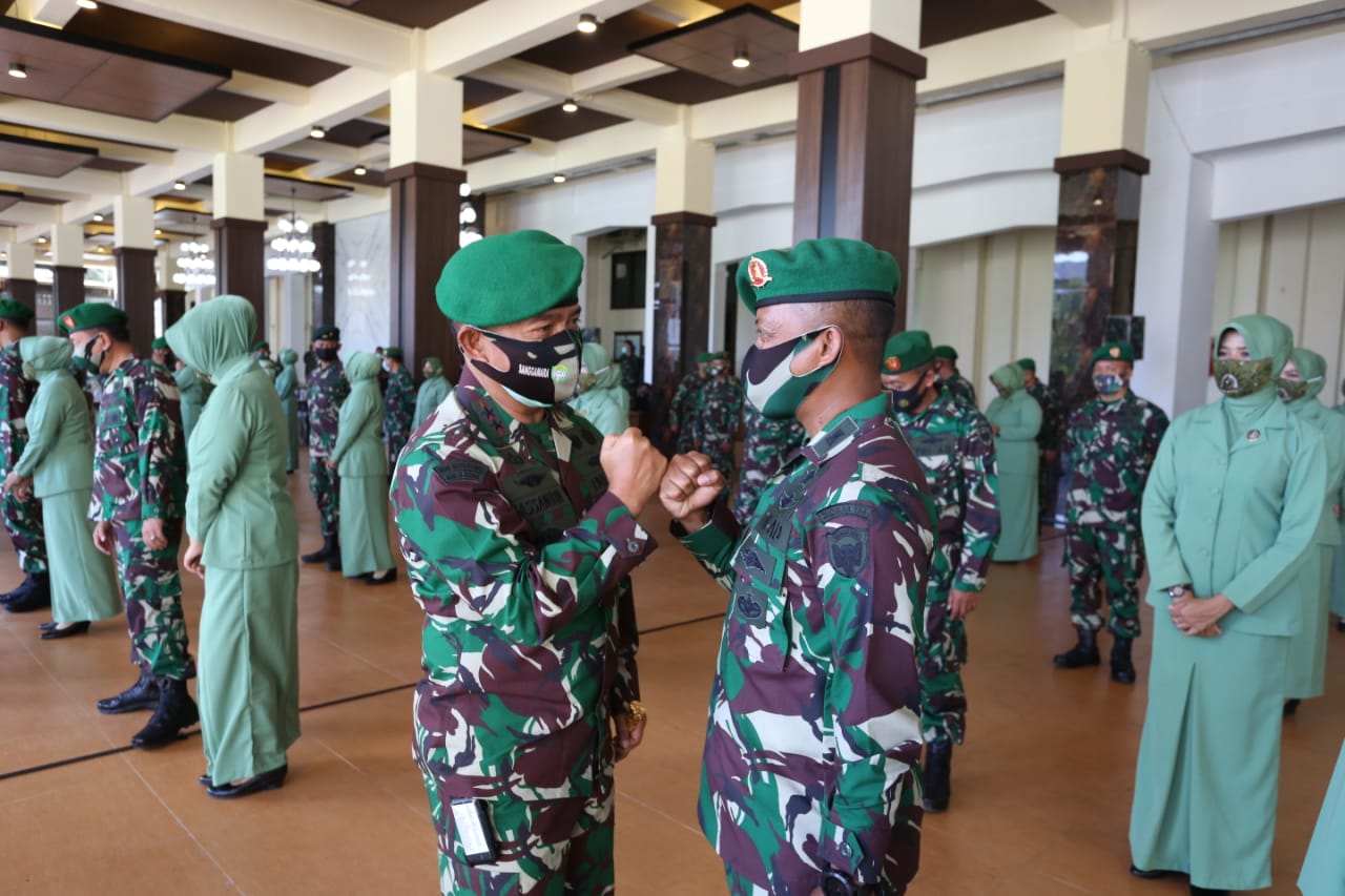 Banda Aceh – Panglima Kodam Iskandar Muda (Pangdam IM) Mayjen TNI Hassanudin, S.I.P., M.M., menerima Laporan Korps Kenaikan Pangkat Perwira jajaran Kodam IM Periode 1 Oktober 2020 di Aula Baru Makodam IM, Kamis (1/10/2020).