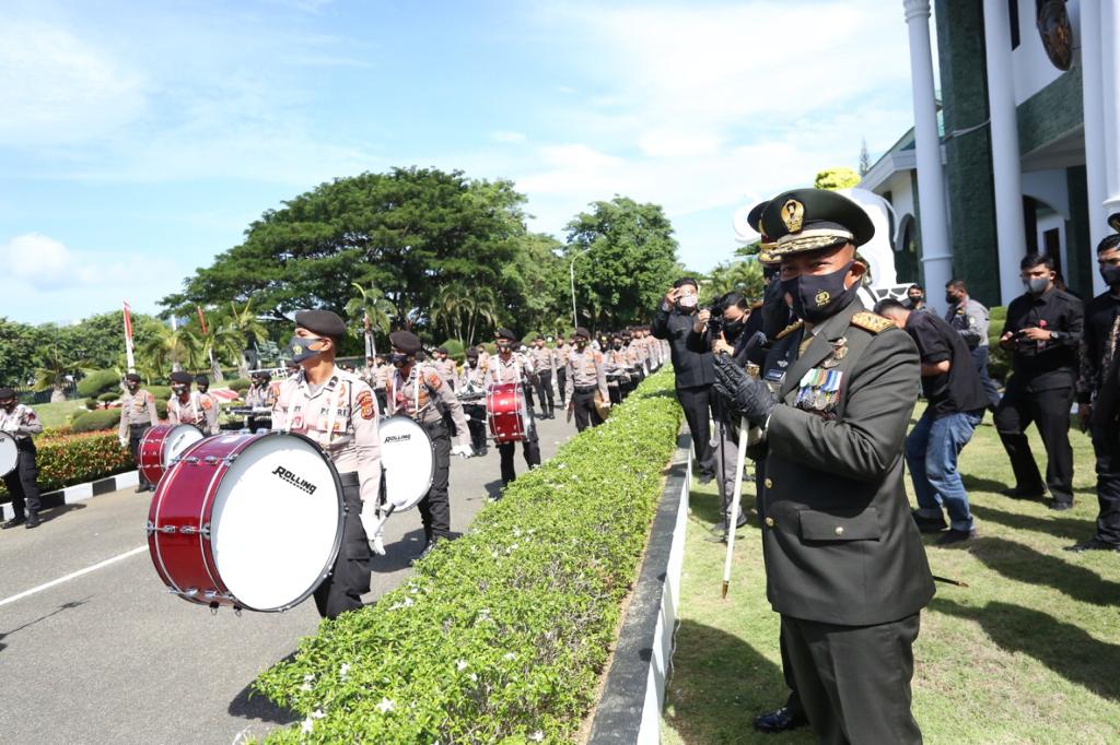 Tak hanya itu, Panglima juga diberikan kejutan lagi. Tiba-tiba alunan musik marching band yang dimainkan oleh puluhan personel Polri menambah semarak perayaan ulang tahun TNI di kota berjuluk Serambi Mekkah ini.