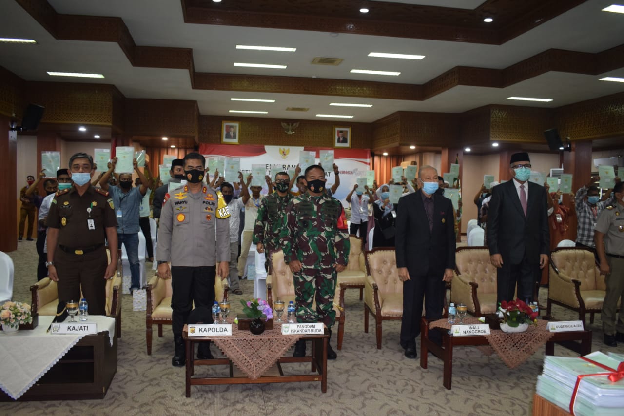 Pangdam IM yang didampingi Aslog Kasdam IM bersama seluruh unsur Forkopimda Aceh dan masyarakat penerima sertifikat tanah menyaksikan prosesi tersebut di Gedung Serba Guna, Kantor Gubernur Aceh.