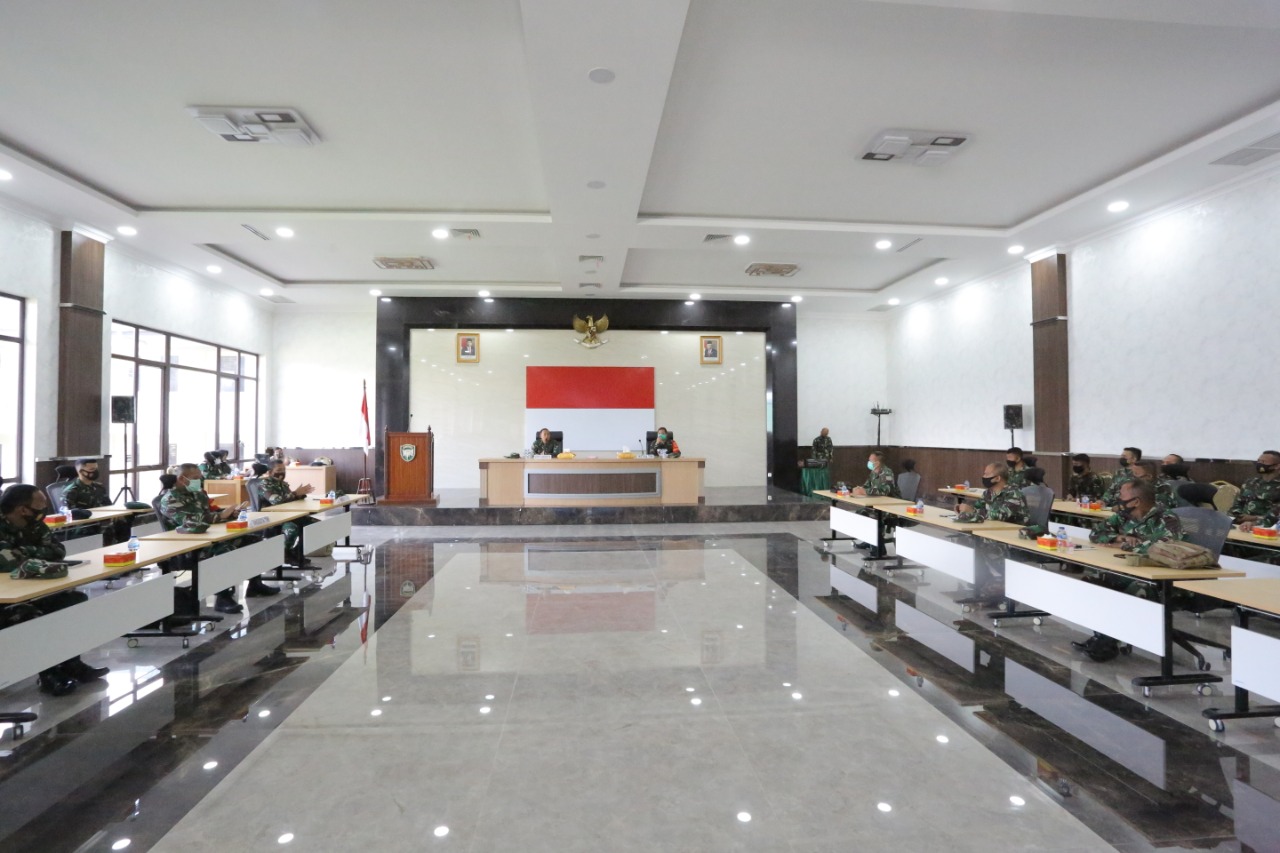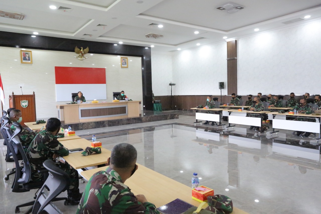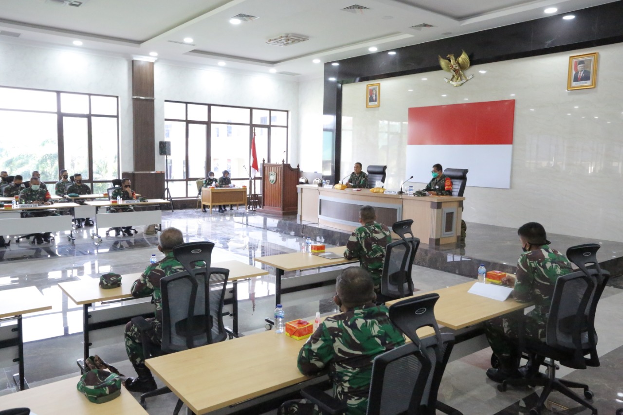 Banda Aceh – Asisten Operasi Kepala Staf Kodam Iskandar Muda (Asops Kasdam IM) Kolonel Inf Dwi Sasongko, S.E., membuka Rapat Rencana Garis Besar (RGB) Tim Pengawasan dan Evaluasi Operasi (Wasev Ops) Disiplin Protokol Kesehatan Covid-19 di Aula Yudha Makodam IM, Jumat (11/12/2020).