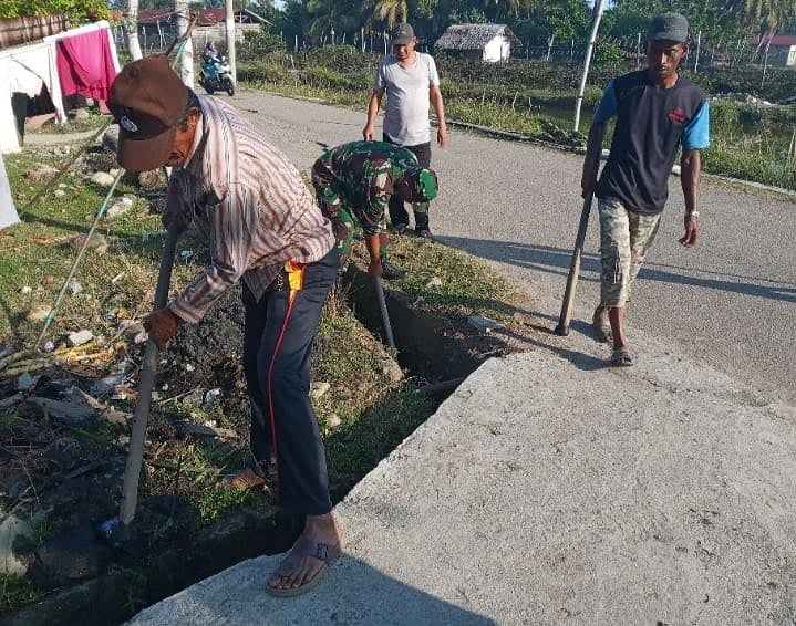 ABDYA – Bintara Pembina Desa (Babinsa) Desa tangan tangan Cut Serda Yudi Hartanto yang merupakan anggota Posramil 08/Setia jajaran Kodim 0110/Abdya bersama masyarakat melaksanakan karya bhakti dengan gotong royong membersihkan parit perkampungan warga yang berada Desa Tangan tangan Cut Kecamatan Setia, Selasa (22/12/2020)