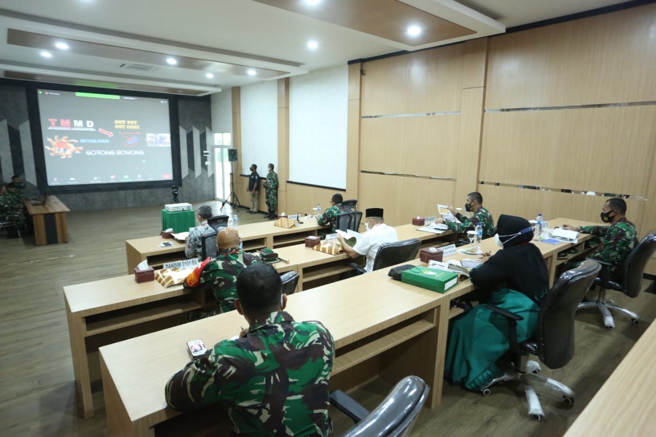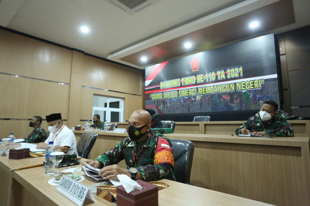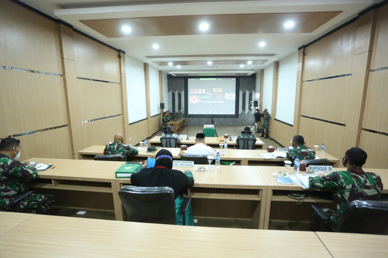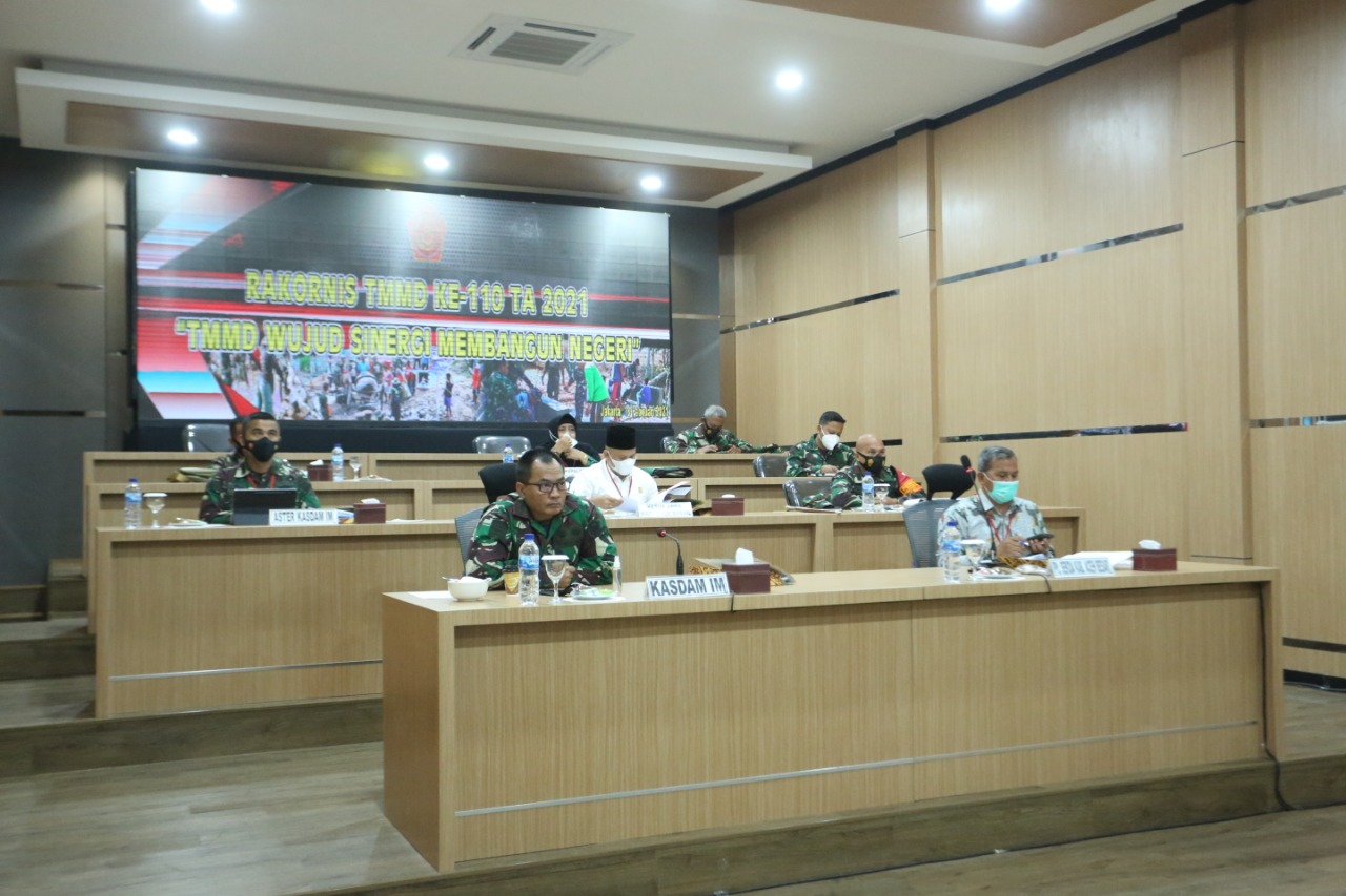 Banda Aceh – Kepala Staf Kodam Iskandar Muda (Kasdam IM), Brigjen TNI Joko Purwo Putranto, M.Sc., menghadiri Rapat Koordinasi Teknis (Rakornis) TNI Manunggal Membangun Desa (TMMD) ke-110 Tahun Anggaran 2021 secara virtual pada Kamis, 18 Februari 2021 di Ruang Puskodal Makodam IM, Kota Banda Aceh.