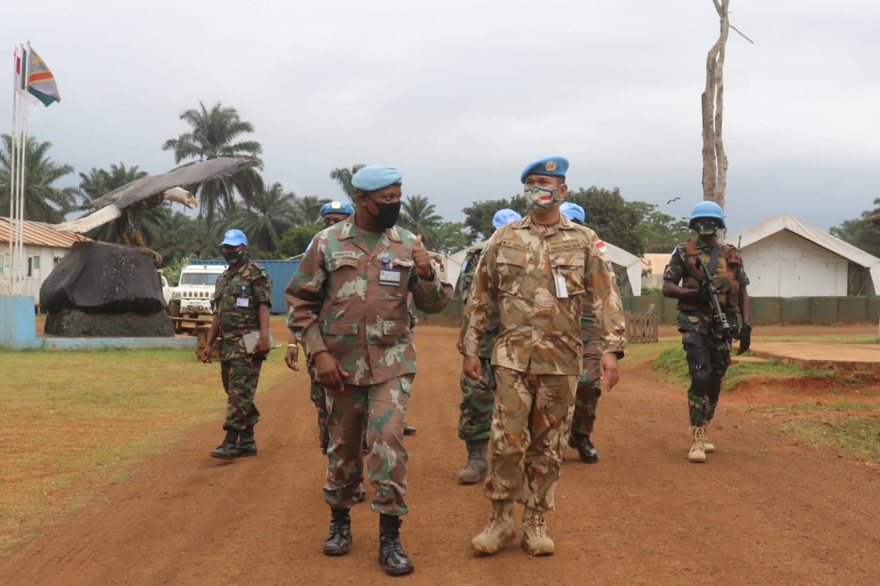 Satuan Tugas (Satgas) Kompi Zeni (Kizi) TNI Kontingen Garuda (Konga) XX-Q/Mission de LOrganisation des Nations Unies pour La Stabilisation En Republique Democratique du Congo (MONUSCO) menerima kunjungan kerja Komandan Force Intervention Brigade (FIB) MONUSCO Brigadier General M. Dyakopu di markas Indo Eng Coy bertempat di Bumi Nusantara Camp, Mavivi, Republik Demokratik Kongo, Kamis (18/02/2021).