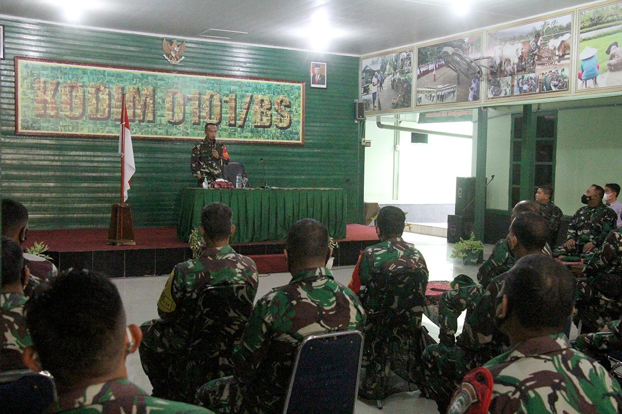 Hal tersebut disampaikan Dandim saat memberikan pengarahan kepada para Danramil dan Babinsa Koramil jajaran Kodim 0101/Aceh Besar di Aula Makodim 0101/Aceh Besar Jalan S.T.A Mahmudsyah Nomor 32, Gampong Baro, Kecamatan Baiturrahman, Kota Banda Aceh, Senin (8/11/2021).