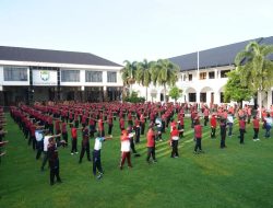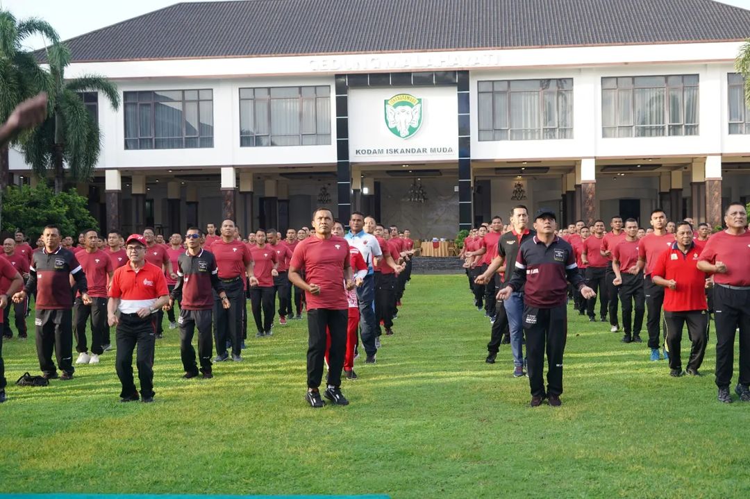 Banda Aceh. Panglima Komando Daerah Militer Iskandar Muda (Pangdam IM), Mayor Jenderal TNI Mohamad Hasan melaksanakan olah raga bersama yang bertajuk “Menjaga Kesempatan Jasmani dan Kebersamaan dengan Seluruh Prajurit Serta Pembinaan Sinergitas dengan Polri dan Forkopimda Aceh” bertempat di Lapangan Makodam Iskandar Muda.(14/2/23).
