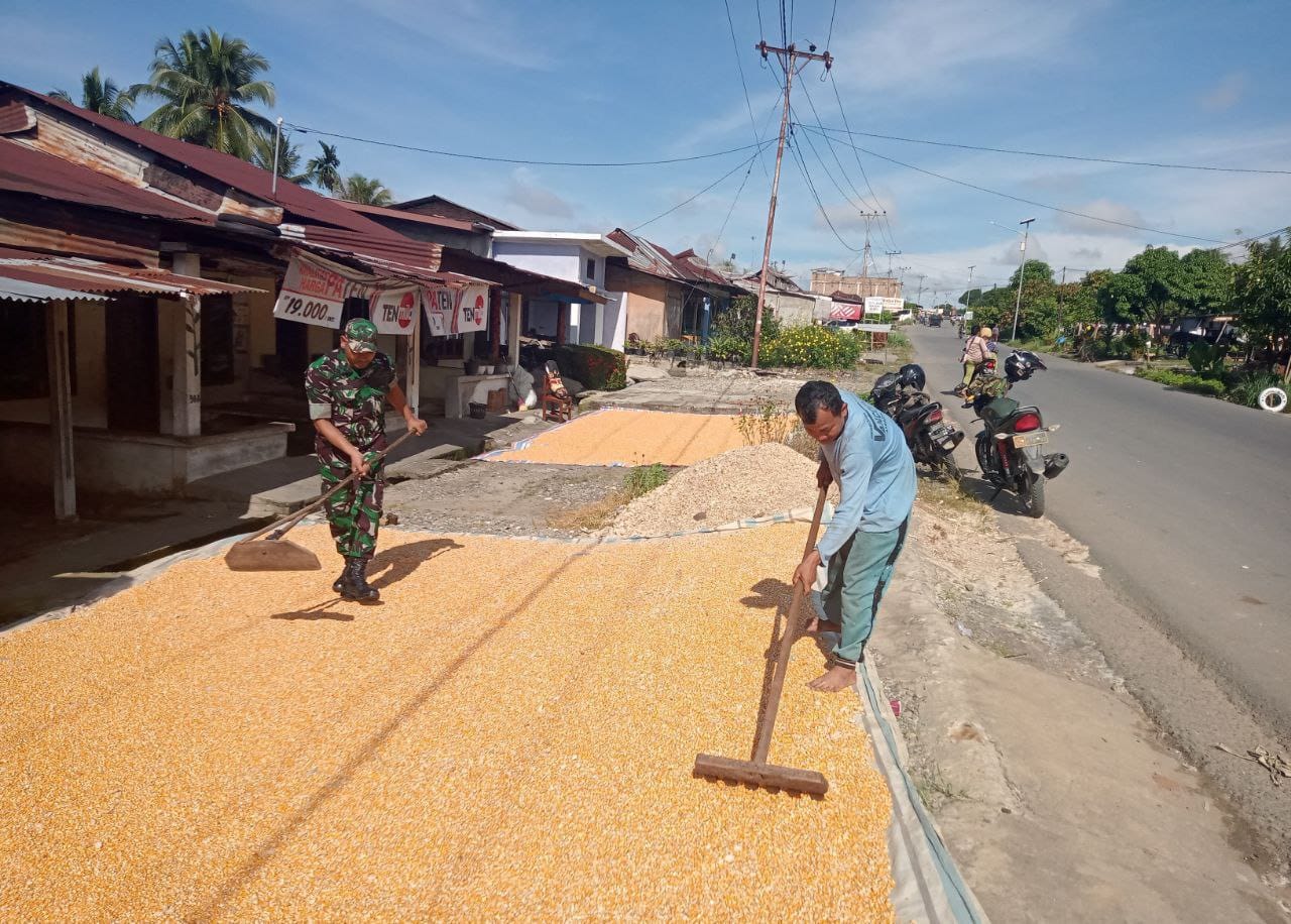 Kutacane – Babinsa Posramil Babul makmur Serda Ayat jajaran Kodim 0108/Agara,membantu warga menjemur jagung pasca panen jagung p-32 milik bapak kamto di Desa Sejahtera Kecamatan Babulmakmur Kabuoaten Aceh Tenggara,Minggu (23/04/23)