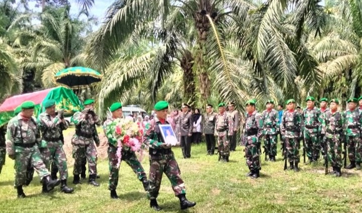 ACEH SINGKIL — Danramil 0109-04/Simpang Kanan Kapten lnf Asfimal mewakili Komandan Kodim 0109/Aceh Singkil memimpin upacara pemakaman secara Militer kepada Almarhum Kopka Etriamantoni yang di kebumikan di Desa Lipat Kajang Atas, Kecamatan Simpang Kanan, Kabupaten Aceh Singkil, Rabu (03/05/2023).