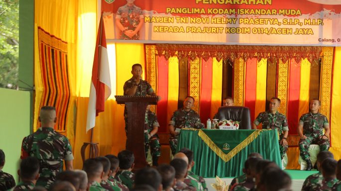 Calang/Meulaboh – Panglima Komando Daerah Militer Iskandar Muda (Pangdam IM) Mayor Jenderal TNI Novi Helmy Prasetya, S.I.P, M.I.P didampingi Ketua Persit KCK Daerah Iskandar Muda, Ny. Iin Novi Helmy Prasetya melakukan Kunjungan Kerja (Kunker) ke Komando Distrik Militer (Kodim) 0114/Ajaya dan Komando Distrik Militer (Kodim) 0105/Abar, Rabu (03/05/23).