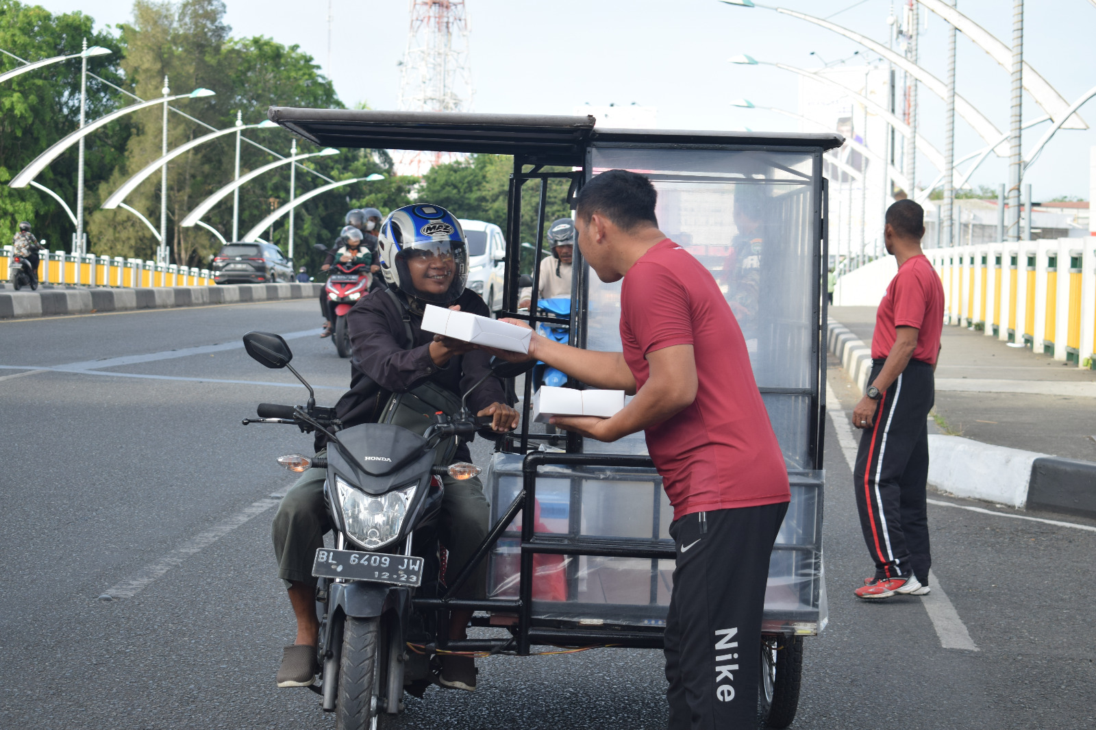 Pada kesempatan tersebut Kodam IM membagikan 290 paket makanan siap saji berupa sarapan pagi kepada masyarakat yang berhak menerima, seperti Tukang Ojek Online, pemulung, petugas kebersihan dan Tukang becak di seputaran Kota Banda Aceh.