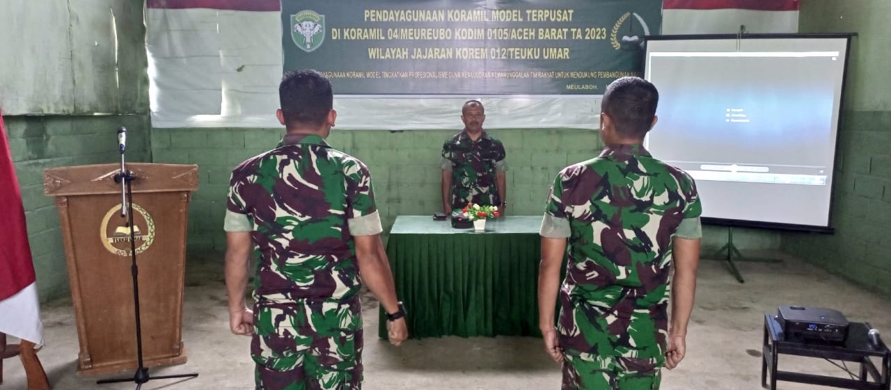 Aceh Barat – Guna meningkatkan SDM Babinsa agar lebih profesional dan berkualitas, Kodim 0105/Abar menggelar kegiatan Pendayagunaan Koramil Model terpusat Semester I TA. 2023 di wilayah Korem 012/TU bertempat di Aula Serba Guna Makoramil 04/Meureubo yang berlokasi di Jalan TMMD Desa Paya Peunaga Kecamatan Meureubo, Senin (8/5/2023)