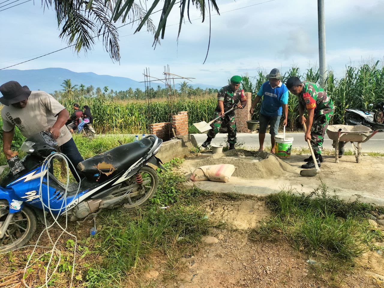 Kutacane – personil Babinsa Koramil 0108-01/Lawe Sigala Sertu Lancar ,Serda Sal Junaidi dan Serda Mardianto melaksanakan gotong royong pembangunan gapura perbatasan di Desa Sukadame dan Desa Sukajaya Kecamatan Lawe Sigala gala Kabupaten Aceh Tenggara, Kamis (11/05/23).
