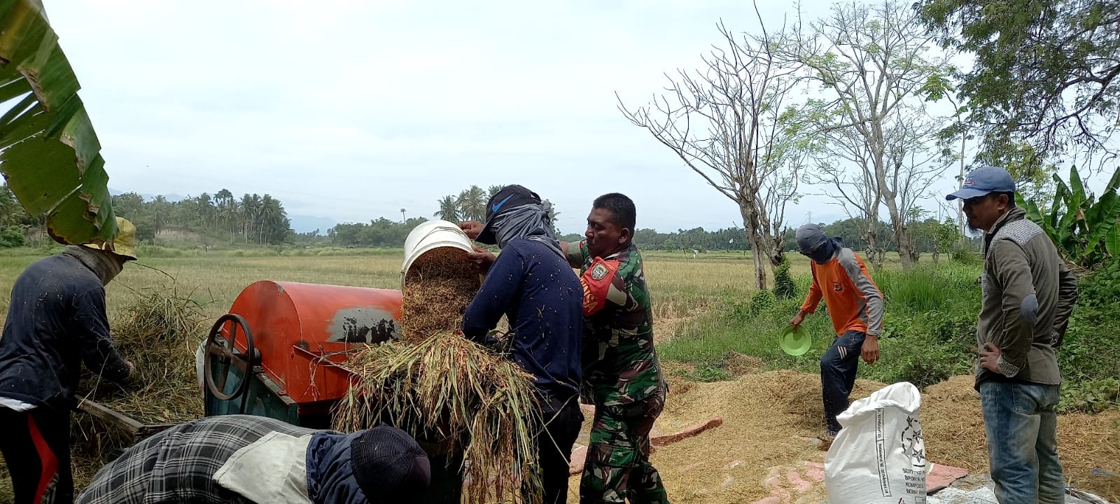 Bireuen-Koptu Munawarah Babinsa Koramil 08/Gandapura Kodim 0111/Bireuen membantu warga Kegiatan tersebut dilaksanakan untuk meringankan kerja Bapak Husaini dan keluarga nya saat proses perontokan hasil panen padi yang telah dipotong dari sawahnya di Desa Cot Tunong Kecamatan Gandapura Kabupaten Bireuen,Kamis (11/5/2023)