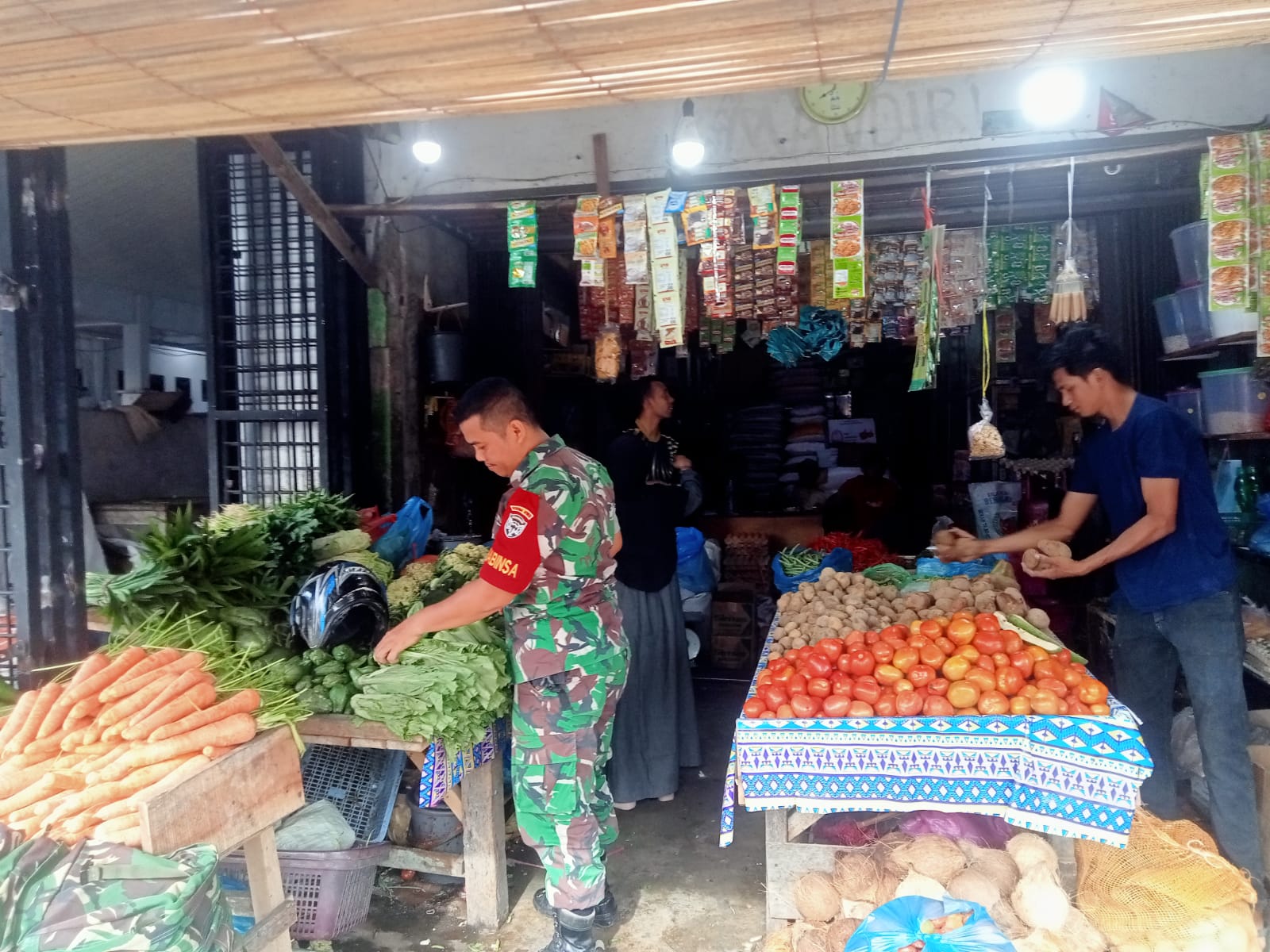 “kita terus rutin monitoring kegiatan pasar guna memberi rasa aman dan kenyamanan bagi pembeli dan penjual,serta mengantisipasi kenaikan harga sehingga kami Babinsa akan bergerak untuk melakukan pengecekan langsung ke Pasar diwilayah binaan binaan kami “Ujar Babinsa