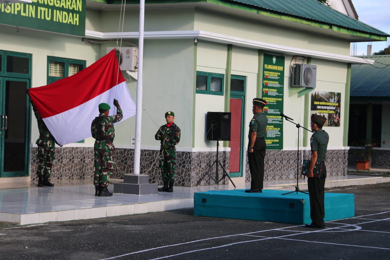 Aceh Barat – Kepala Staf Kodim (Kasdim) 0105/Abar Mayor Inf Mazwar As’adi Riyanto memimpin Upacara Bendera Merah Putih rutin yang diikuti oleh para Perwira Staf, Danramil/Danposramil dan seluruh Prajurit serta PNS bertempat di Lapangan Apel Makodim setempat berlokasi di Jalan Imam Bonjol Desa Drien Rampak Kecamatan Johan Pahlawan, Senin (26/6/2023)