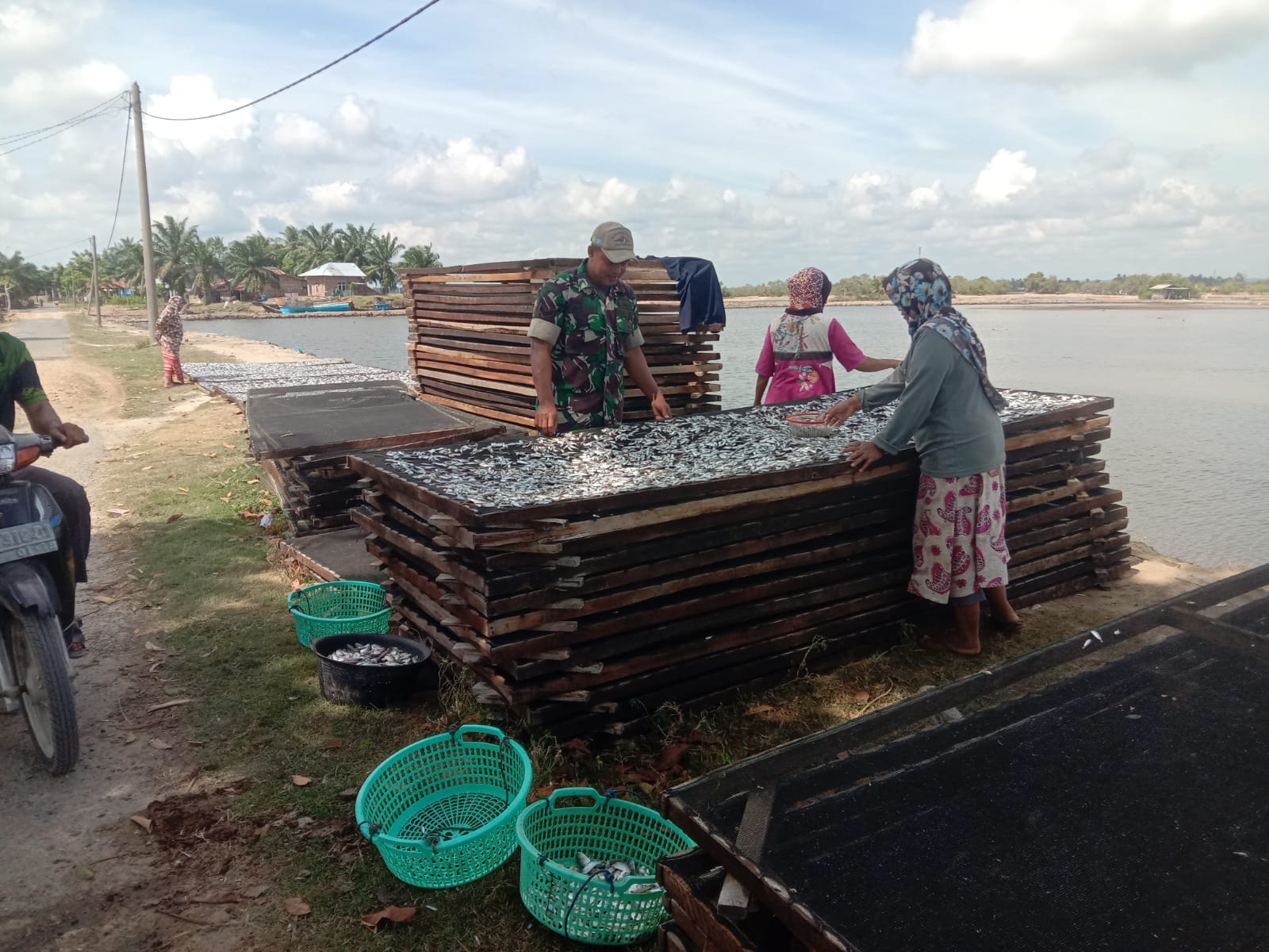 Dalam kegiatan sambangi tersebut, Babinsa melaksanakan Komunikasi Sosial (Komsos) dengan Ibu Zulaiha yang sebagai berprofesi sebagai Pengolah Ikan Asin. Aparat Kewilayahan itu juga memantau, serta membantu para pekerja untuk menjemur Ikan Asin hasil olahan.