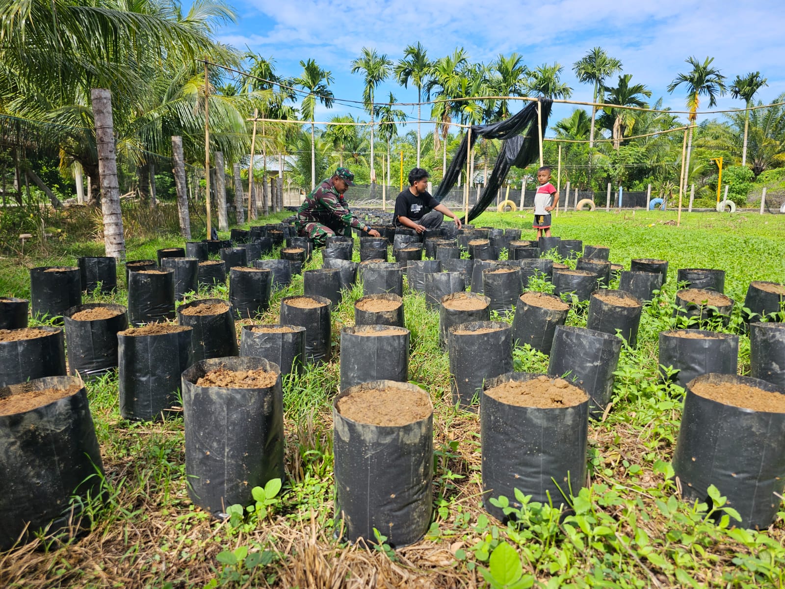 ACEH SELATAN – Babinsa Koramil 13/Kluet Timur Kodim 0107/Aceh Selatan Serda Zainal Amri ikut membantu pembibitan kelapa sawit unggul yang dikembangkan pemuda di Desa Paya Dapur Kecamatan Kluet Timur Kabupaten Aceh Selatan, Sabtu (08/7/2023).
