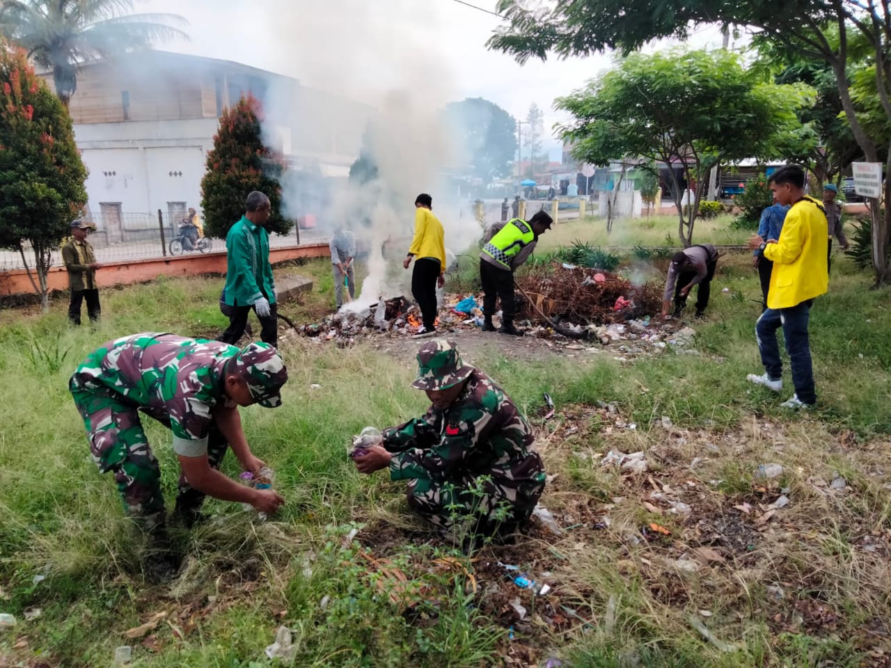 Mulai pagi tampak anggota dari kedua institusi tersebut bahu membahu membersihkan parit dan sampah kanan kiri jalan.