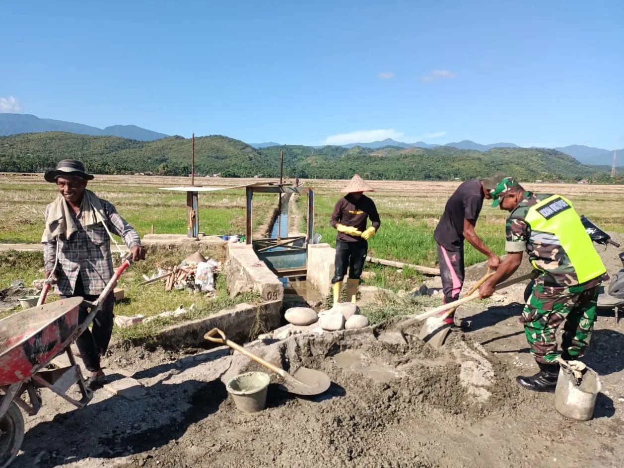 Pidie Jaya – Guna terciptanya Sinergitas TNI bersama Rakyat, Babinsa Koramil 19/Meureudu Kodim 0102/Pidie Sertu Umar melaksanakan karya bakti membantu membuat pondasi bedengan saluran irigasi yang rusak bertempat di desa Dayah Tuha kecamatan Meureudu kabupaten Pidie Jaya. Rabu (12/07/2023).