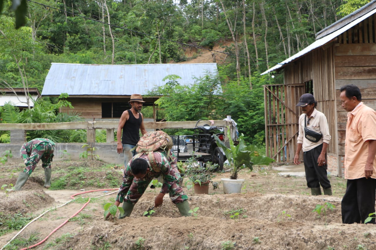 Seperti saat ini salah satu anggota Satgas TMMD Sertu Eko Pirwanto bersama Serda Suyono tampak bersemangat membantu warga memindahkan bibit cabe ke lahan tanam perkebunan warga yang berada tidak jauh dari lokasi sasaran TMMD.