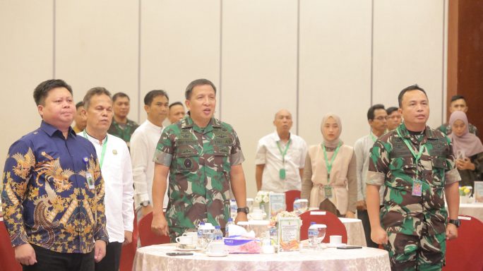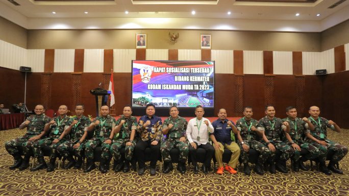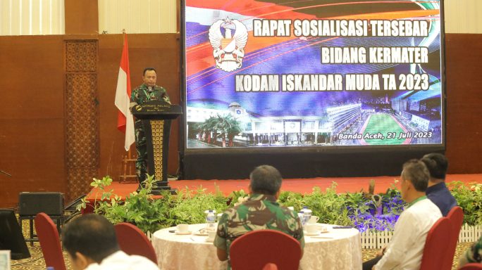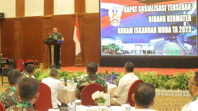 Banda Aceh – Paban VII/Kerjasama Teritorial (Kermater) Sterad Kolonel Inf Jimmy Watusekke mewakili Asisten Teritorial (Aster) Kasad membuka Rapat Sosialisasi Tersebar Bidang Kermater Kodam Iskadar Muda TA 2023 yang berlangsung di Aula Aceh Ballroom, Hermes Palace Hotel pada Jumat (21/07/21).