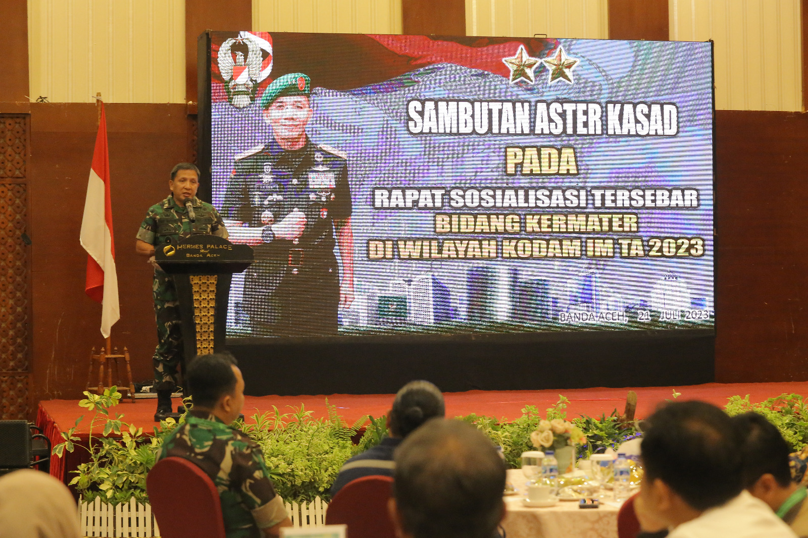 Pada sambutan Aster Kasad yang dibacakan oleh Paban VII/Kermater Sterad menyampaikan rasa terima kasih dan penghargaan yang setinggi-tingginya kepada seluruh peserta Rapat Sosialisasi Tersebar Bidang Kermater di Wilayah Kodam IM TA 2023 atas kehadirannya pada acara ini saya berharap dengan terselenggaranya rapat ini, maka dapat diperoleh pemahaman dan kesamaan persepsi tentang kerja sama teritorial termasuk didalamnya pemahaman terhadap peraturan yang berlaku dalam mekanisme penyusunan maupun pembentukan kerja sama teritorial.