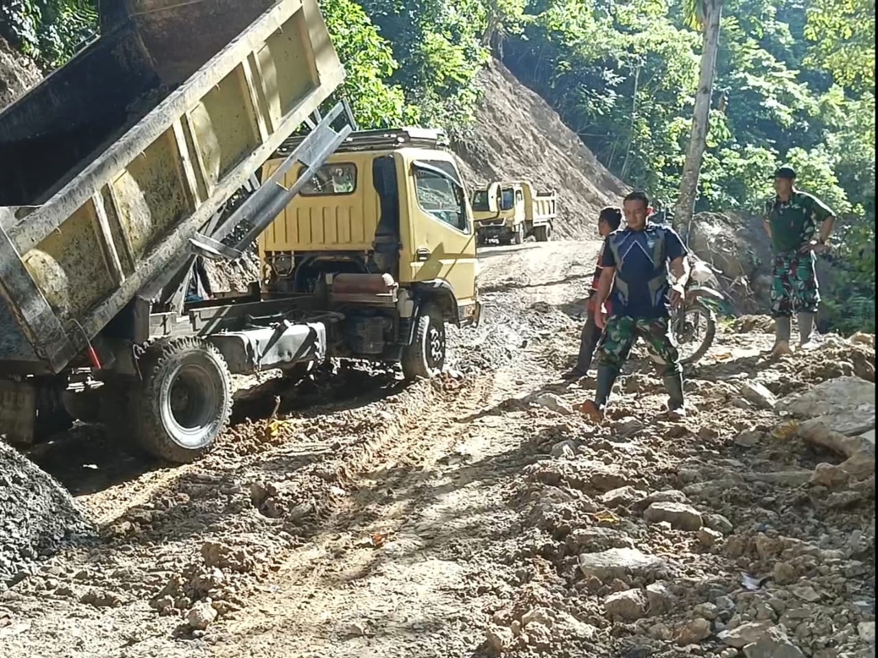Truk bermuatan batu terlihat mulai berdatangan dan menumpahkan muatannya di sepanjang jalan yang akan dilakukan pengerasan guna melancarkan jalur transportasi masyarakat ke kebunnya,target jalan yang dilakukan pengerasan sepanjang 1 Km.pencapaian ini tidak terlepas dari peran warga yang setiap harinya terus membantu pekerjaan fisik Satgas TNI Manunggal Membangun Desa (TMMD) Ke -117 Kodim 0108/Agara.