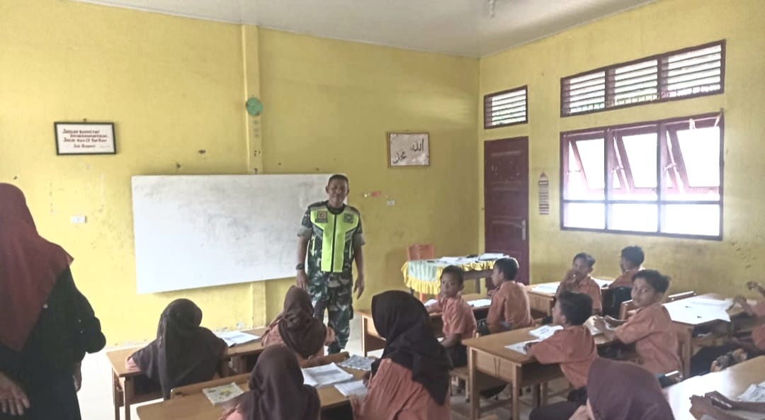 Aceh Timur – Guna menumbuhkan jiwa patriotisme terhadap generasi muda penerus bangsa, Babinsa Koramil 19 /Idm Kodim 0104/Aceh Timur, Serka Yulianto memberikan materi wawasan kebangsaan kepada siswa siswi SD Negeri 1 Blangnisam, Kecamatan Indra Makmu, Kabupaten Aceh Timur, Sabtu (29/072023).