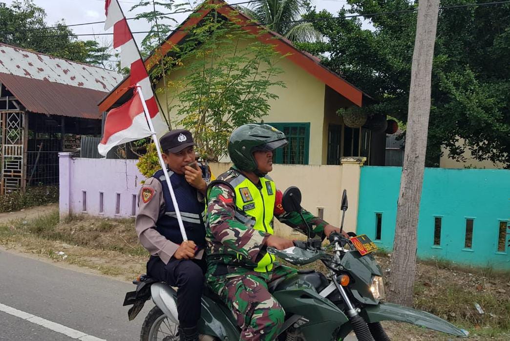 Aceh Timur – Cara unik ditunjukkan anggota TNI dan Polri di Kecamatan Pante Bidari dalam menyerukan dan mengingatkan warga untuk memasang bendera merah putih menyambut HUT ke-78 Republik Indonesia.