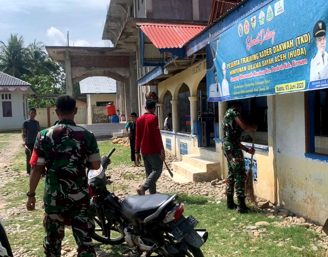 Pandrah – Personel Badak Hitam Yonif RK 113/JS laksanakan Gotong Royong dalam rangka menyambut HUT RI ke – 78 bersama unsur Muspika dan Masyarakat, kegiatan tersebut berlangsung di Kampung Meunasah Reudeup, Kec. Pandrah, Kab. Bireuen, Provinsi Aceh, Minggu, (6/8/2023).