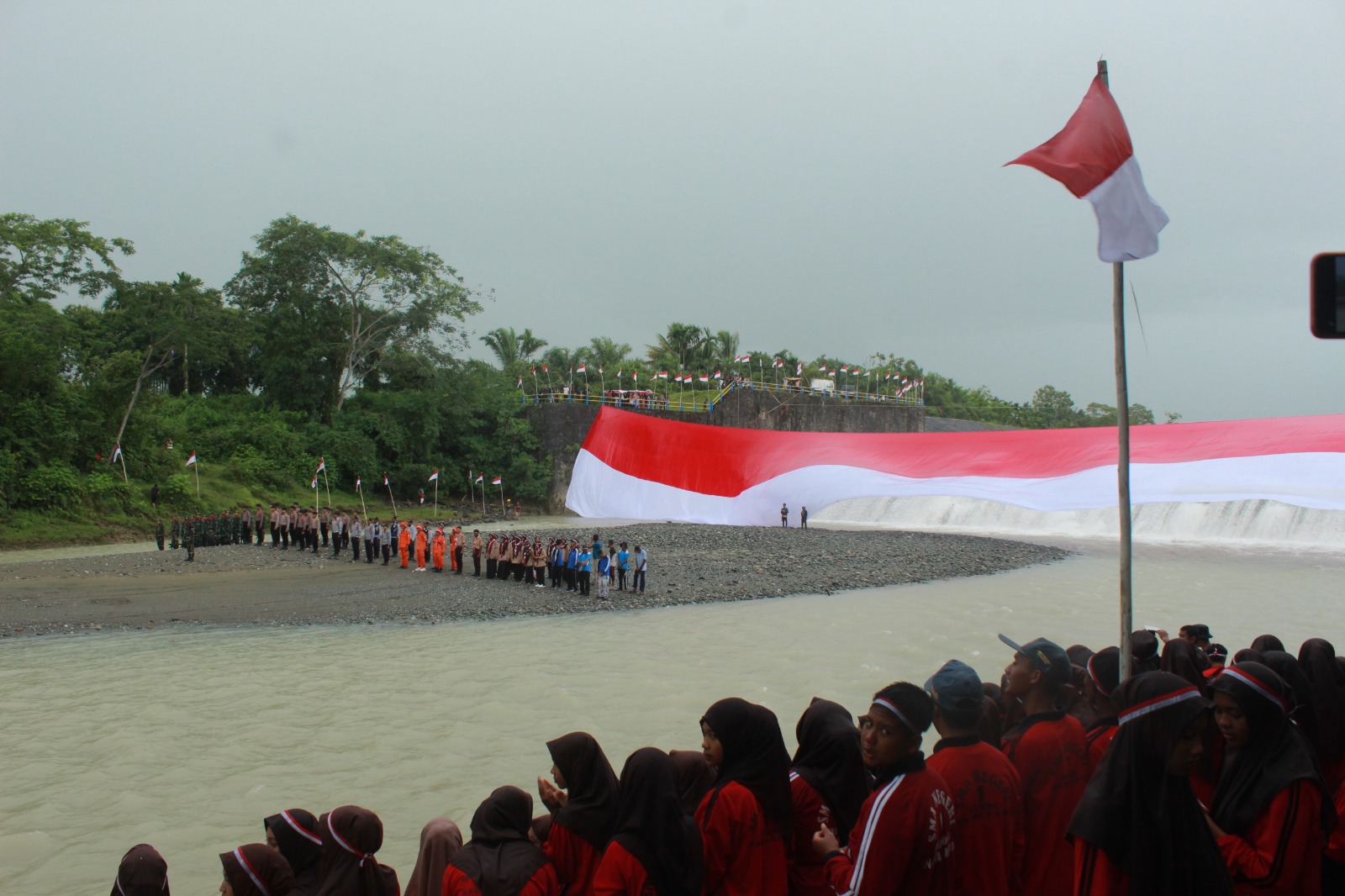Nagan Raya, Dandim 0116/Nagan Raya Letkol Inf Fairuzzabadi, S.H. bersama Pemerintah Kabupaten (Pemkab) Nagan Raya menggelar Apel Kebangsaan dan Pembentangan Bendera Merah Putih berukuran raksasa di Bendungan Irigasi Jeuram Kecamatan Beutong, kabupaten setempat, Sabtu sore (19/8/2023).