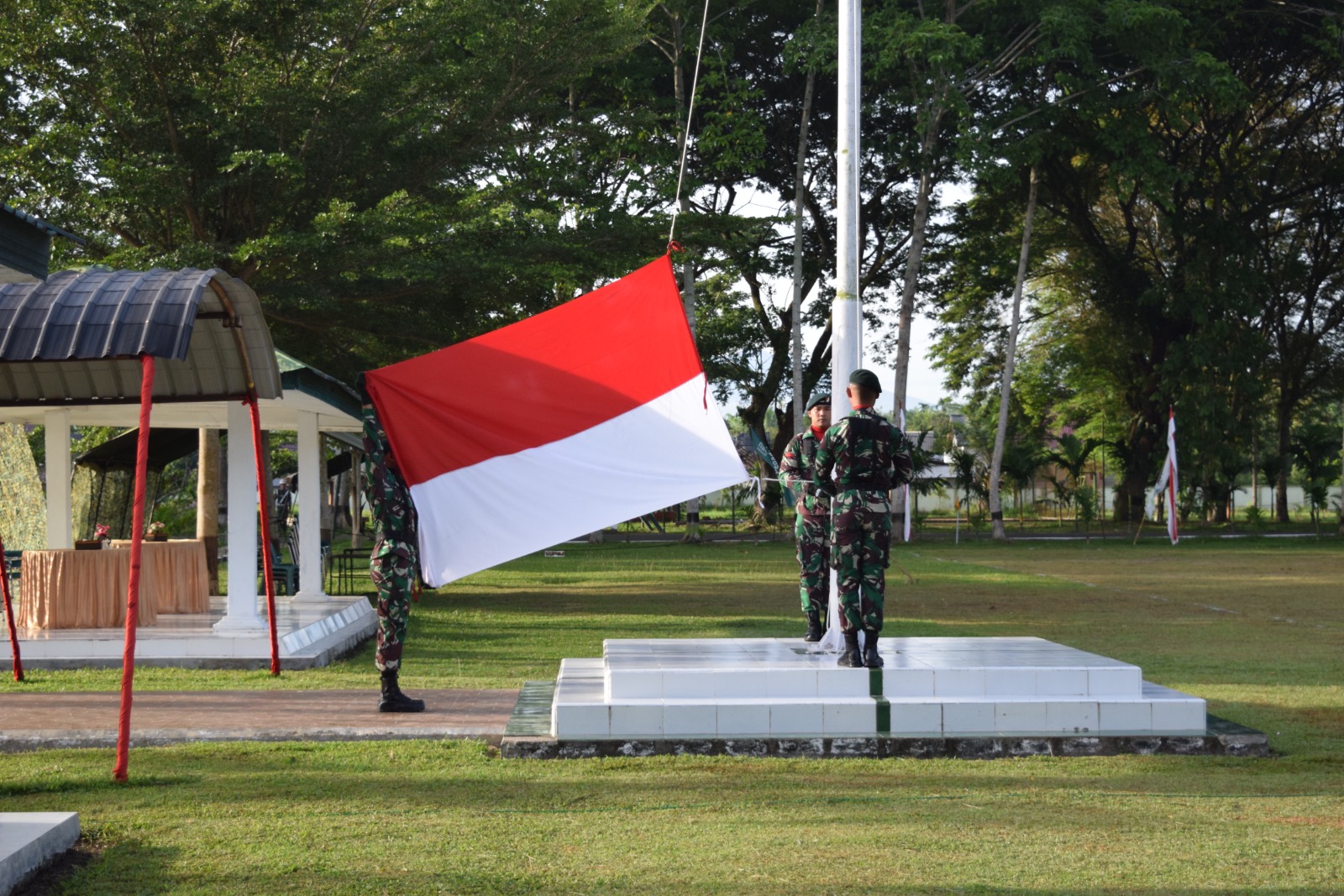 diawali dengan pengibaraan bendera merah putih, Komandan Kompi Bantuan Lettu Inf Arius Adam bertindak sebagai Inspektur Upacara, Komandan Upacara di pimpin oleh Letda Inf Ilman Yadi serta Pengucap Sapta Marga oleh Sertu Ardjunda Amri pada Upacara Pengibaran Bendera Merah Putih dan diikuti oleh segenap Personel Badak Hitam Yonif RK 113/JS.