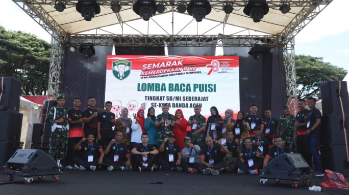 Banda Aceh – Komando Daerah Militer Iskandar Muda (Kodam IM) mengadakan lomba baca puisi dengan penuh semangat dalam rangka memeriahkan peringatan semarak HUT Ke-78 Kemerdekaan Republik Indonesia di Wilayah Kodam Iskandar Muda tahun 2023, di lapangan Blang Padang Kota Banda Aceh, Minggu (27/08/23).