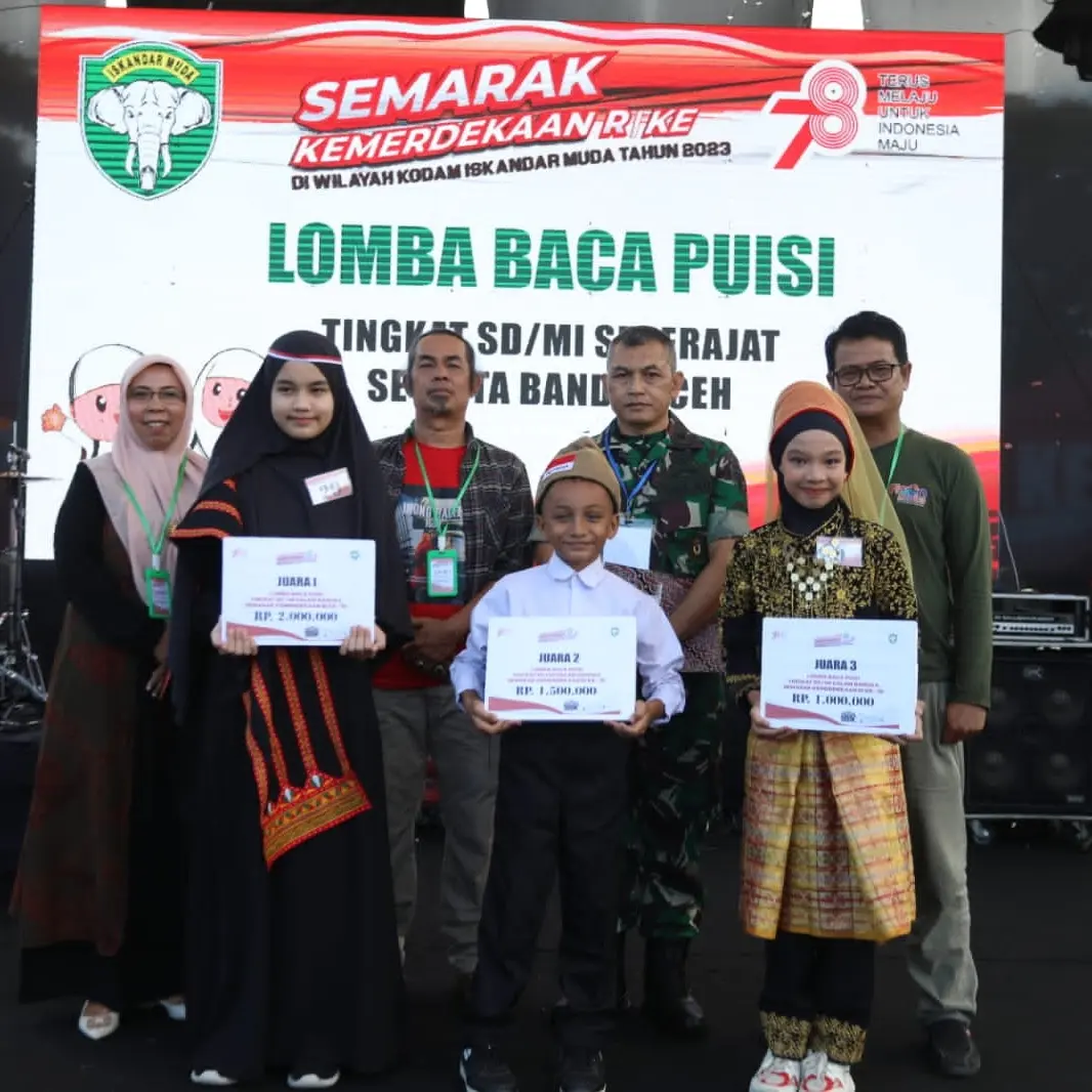 Banda Aceh – Komando Daerah Militer Iskandar Muda (Kodam IM) mengadakan lomba baca puisi dengan penuh semangat dalam rangka memeriahkan peringatan semarak HUT Ke-78 Kemerdekaan Republik Indonesia di Wilayah Kodam Iskandar Muda tahun 2023, di lapangan Blang Padang Kota Banda Aceh, Minggu (27/08/23).
