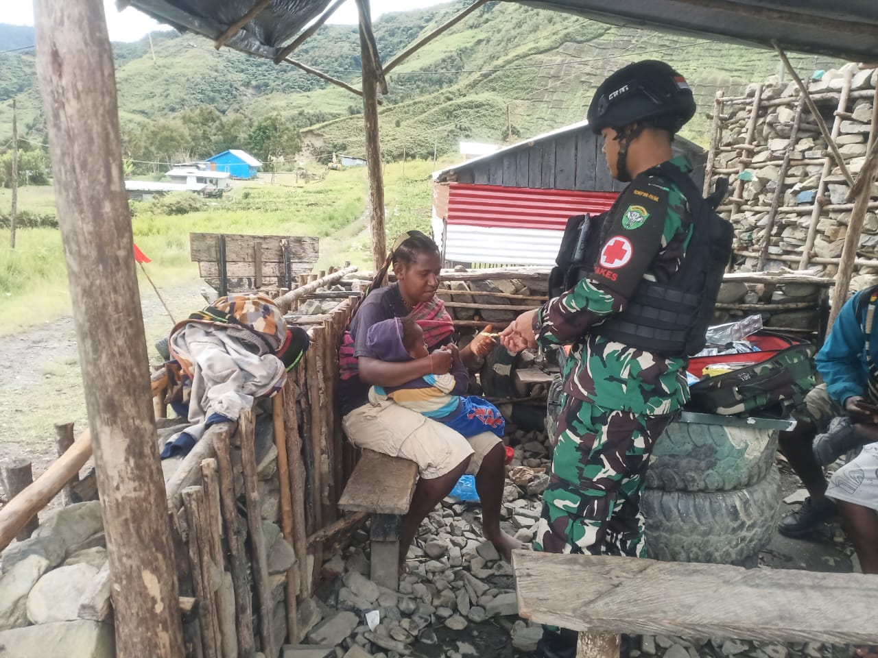 Sebagai upaya mengatasi permasalahan kesehatan masyarakat di Papua, TNI hadir membantu Pemerintah untuk memberikan solusi dengan memberikan pelayanan kesehatan kepada masyarakat yang membutuhkan. Seperti yang dilakukan oleh Satgas Yonif RK 115/ML, yang memberikan pelayanan kesehatan berupa pengobatan gratis kepada mama Papua yang datang ke Pos untuk berobat di Kampung Wuyuneri, Distrik Mulia, Kabupaten Puncak Jaya. Senin (28/8/2023).