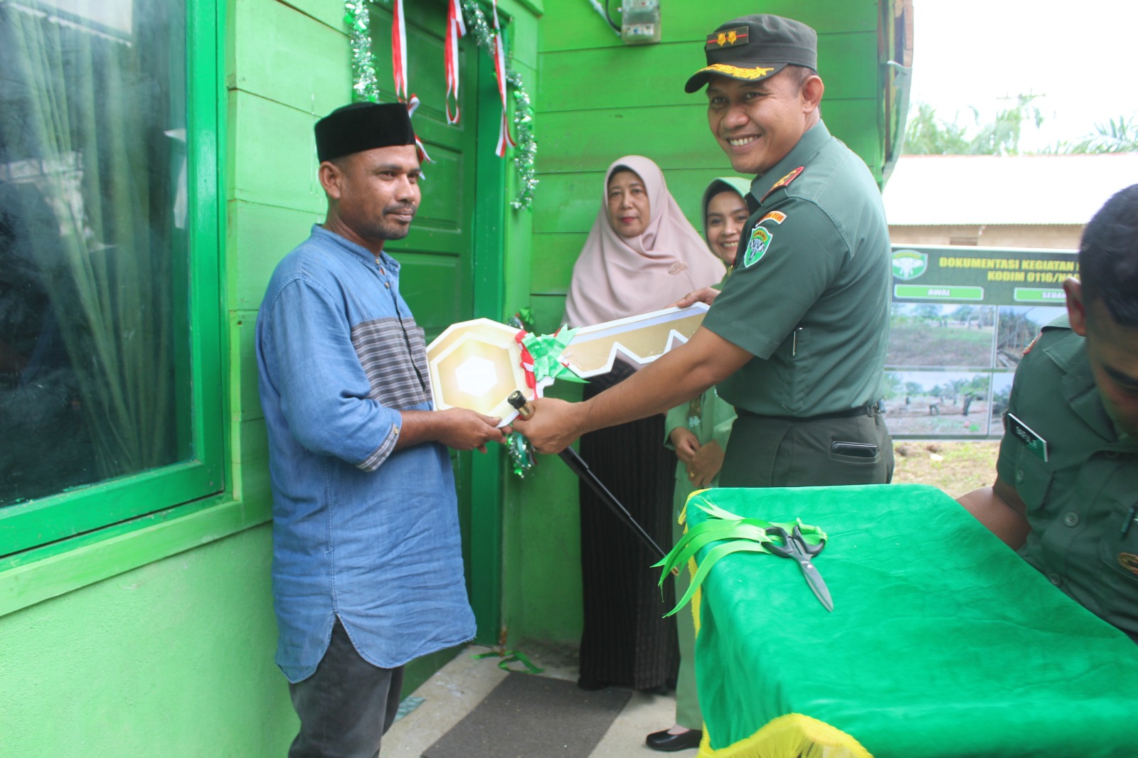 Nagan Raya, Komandan Kodim 0116/Nagan Raya Letkol Inf Fairuzzabadi, S.H. menyerahkan secara simbolis kunci Rumah Tidak Layak Huni (RTLH) kepada Pak Syahrul pemilik rumah di Desa Drien Tujoh Kecamatan Tripa Makmur Kabupaten Nagan Raya, Rabu (06/09/2023).