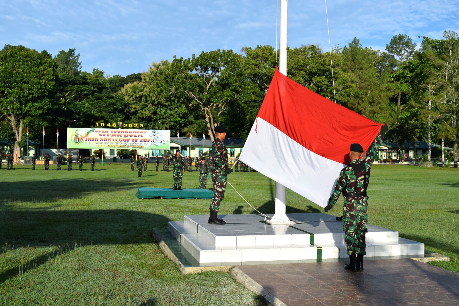 Upacara pengibaran bendera merah putih kali ini dipimpin Inspektur Upacara Lettu Inf Sukamto, Letda Inf Agus Irawan sebagai Komandan Upacara yang diikuti oleh segenap Prajurit Badak Hitam Yonif RK 113/JS. kegiatan diawali dengan pengibaran bendera merah putih dilanjutkan dengan pembacaan teks Pancasila serta pengucapan Sapta Marga oleh Serda Lutfi.